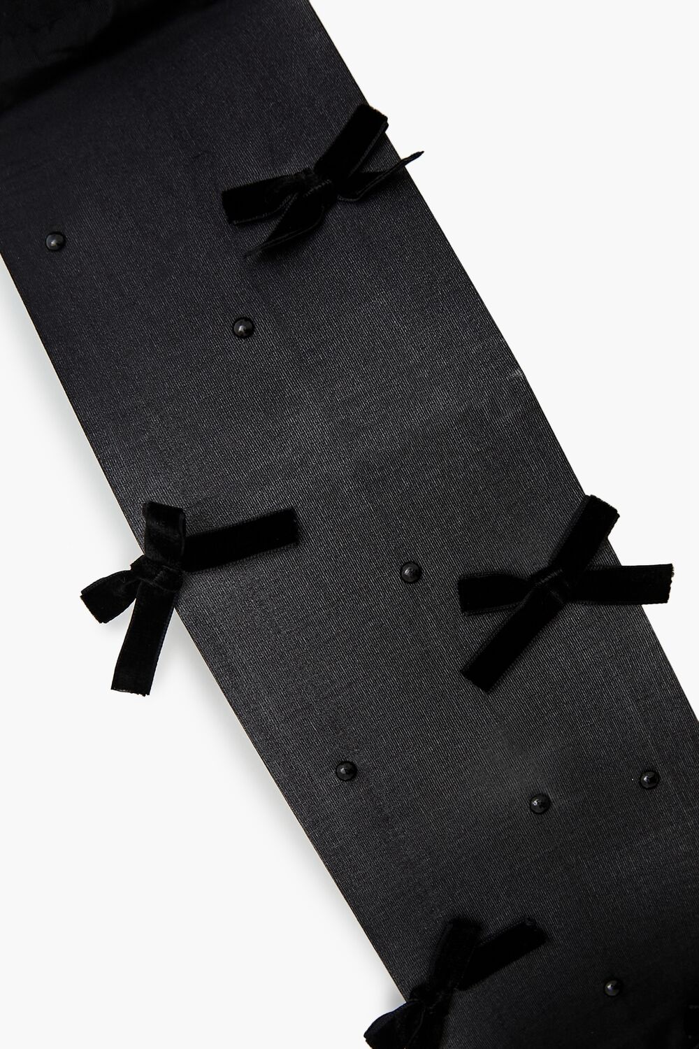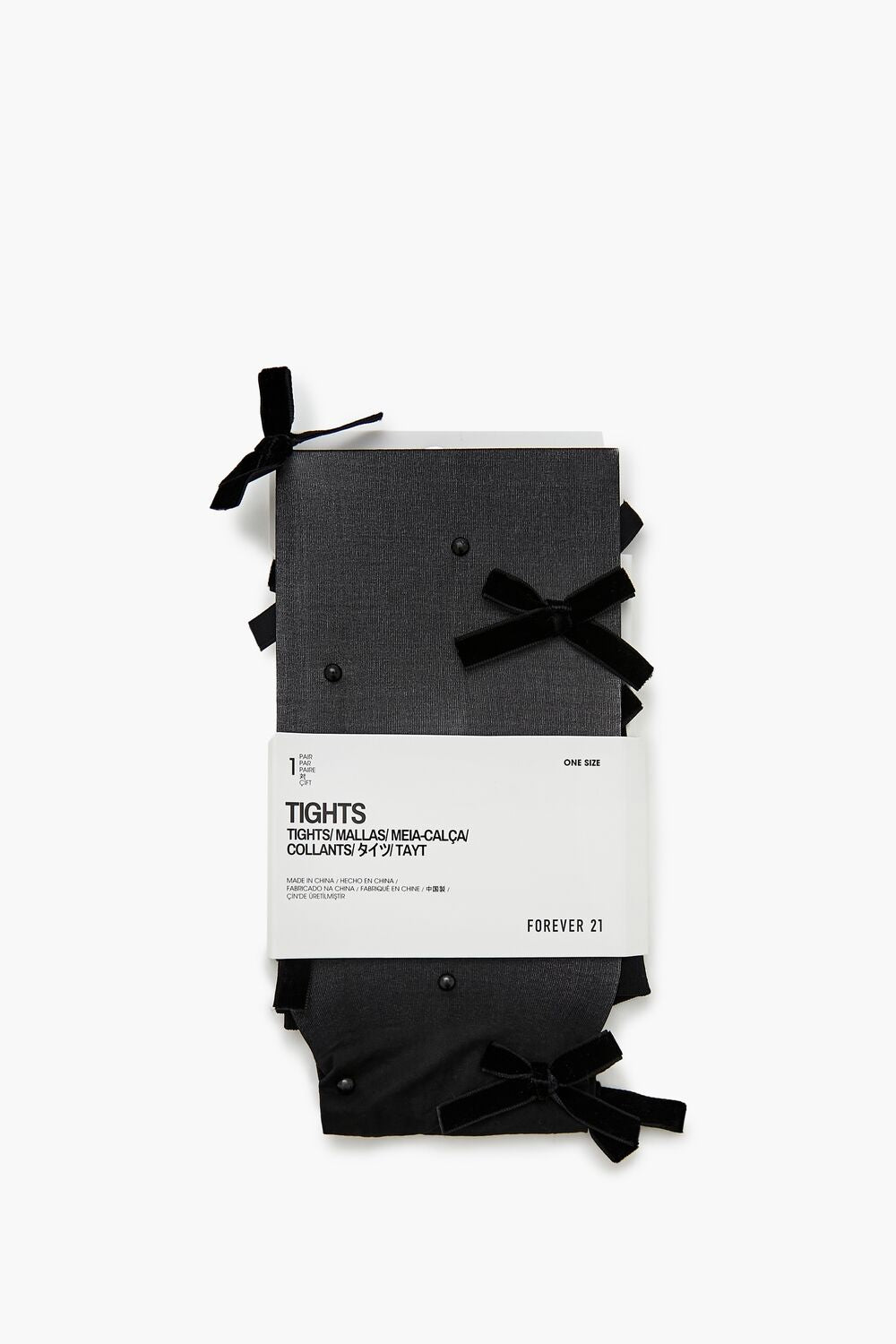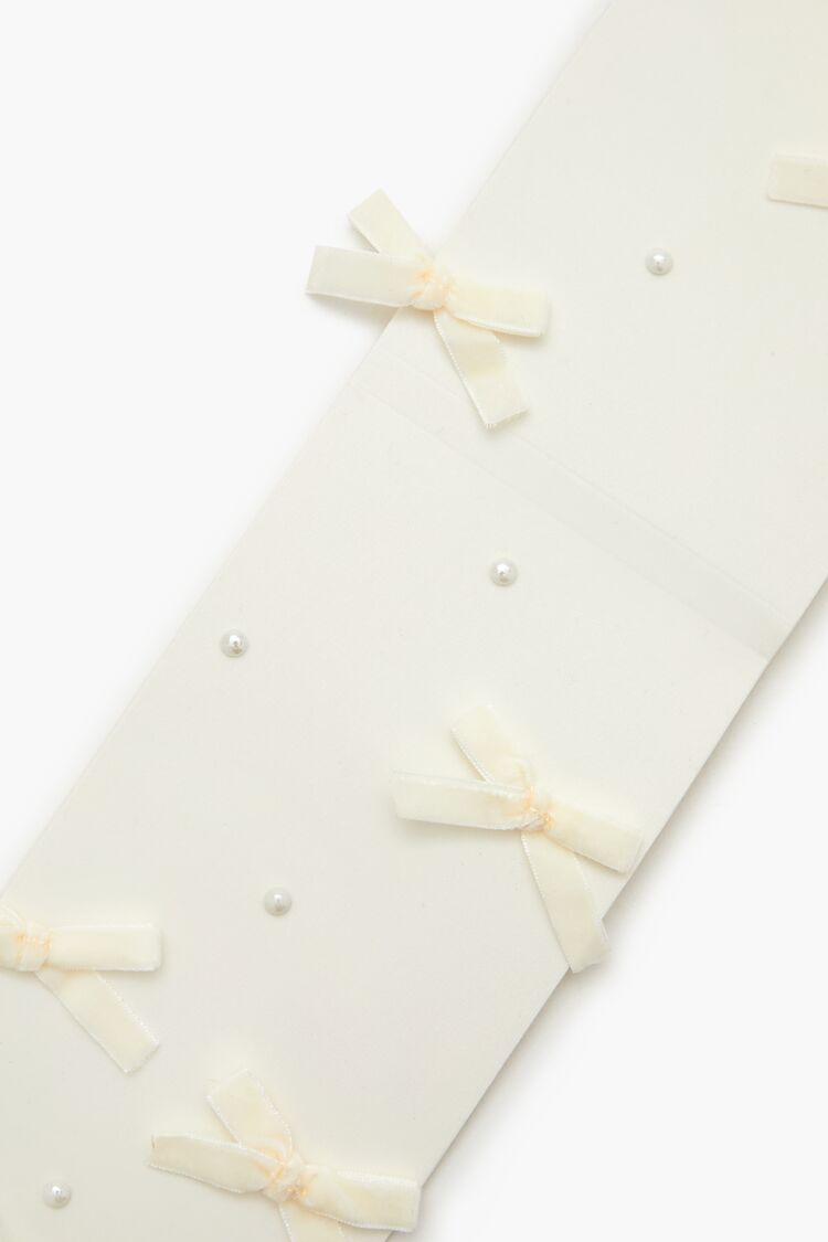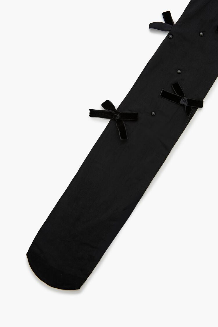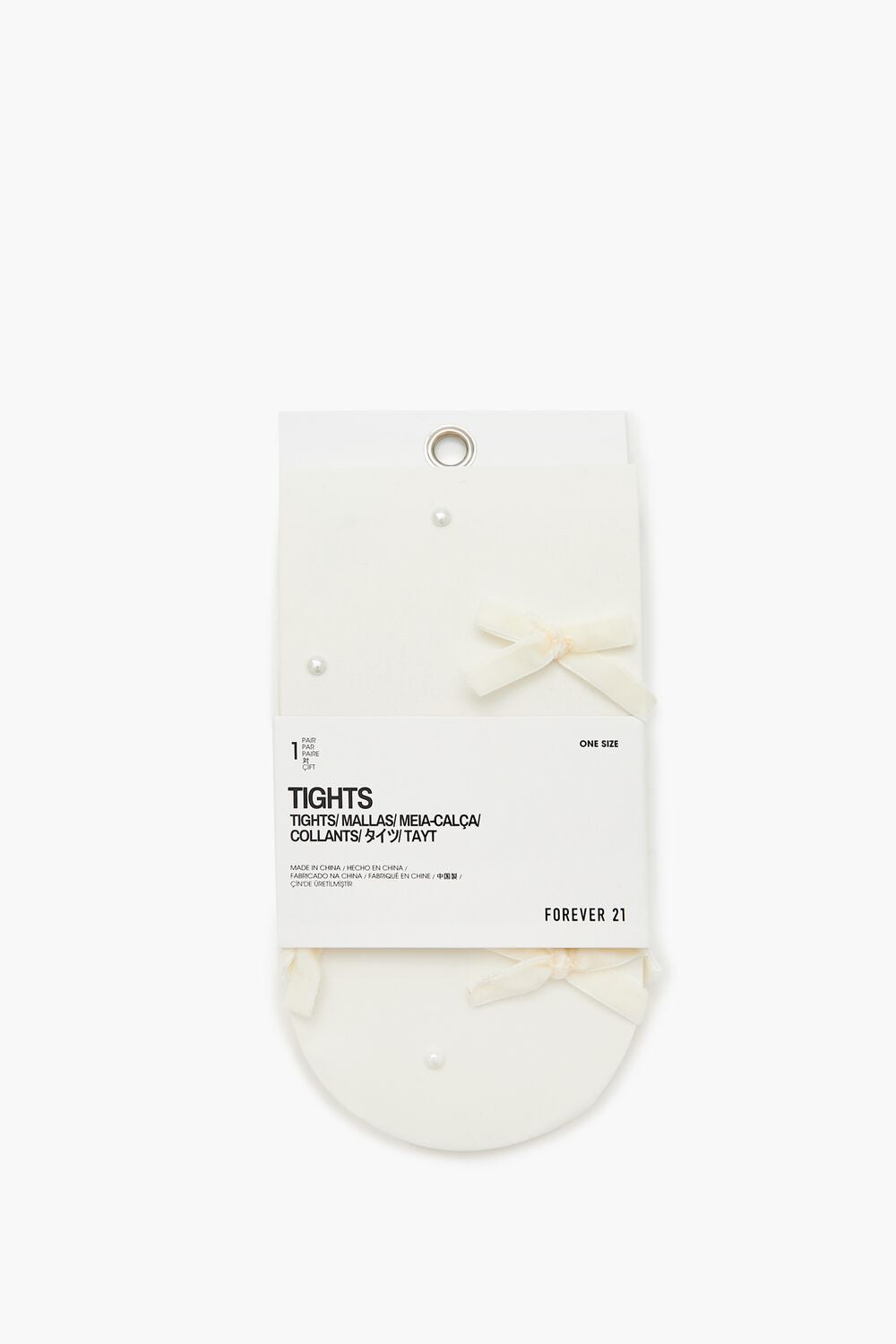 A pair of semi-sheer tights featuring faux pearl and bow embellishments.