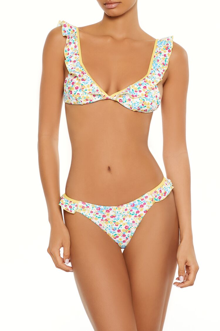A pair of knit bikini bottoms featuring contrasting trim. an allover bright floral print. low-rise waist. ruffle side detailing. high leg. and cheeky cut.