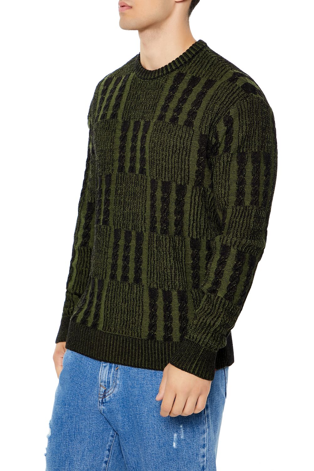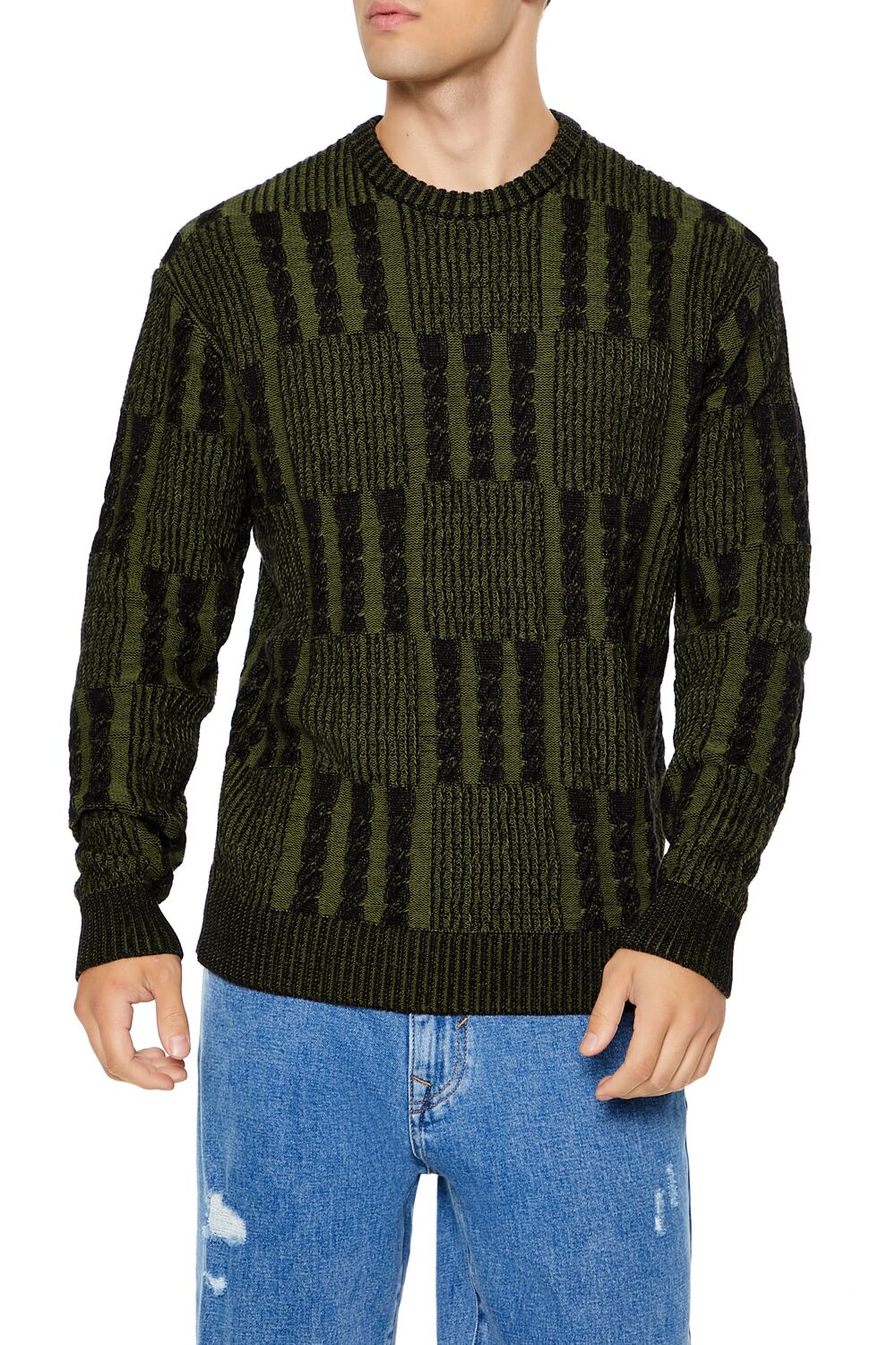 A cable knit sweater featuring ribbed trim. an allover striped checkered pattern. crew neck. and dropped long sleeves.