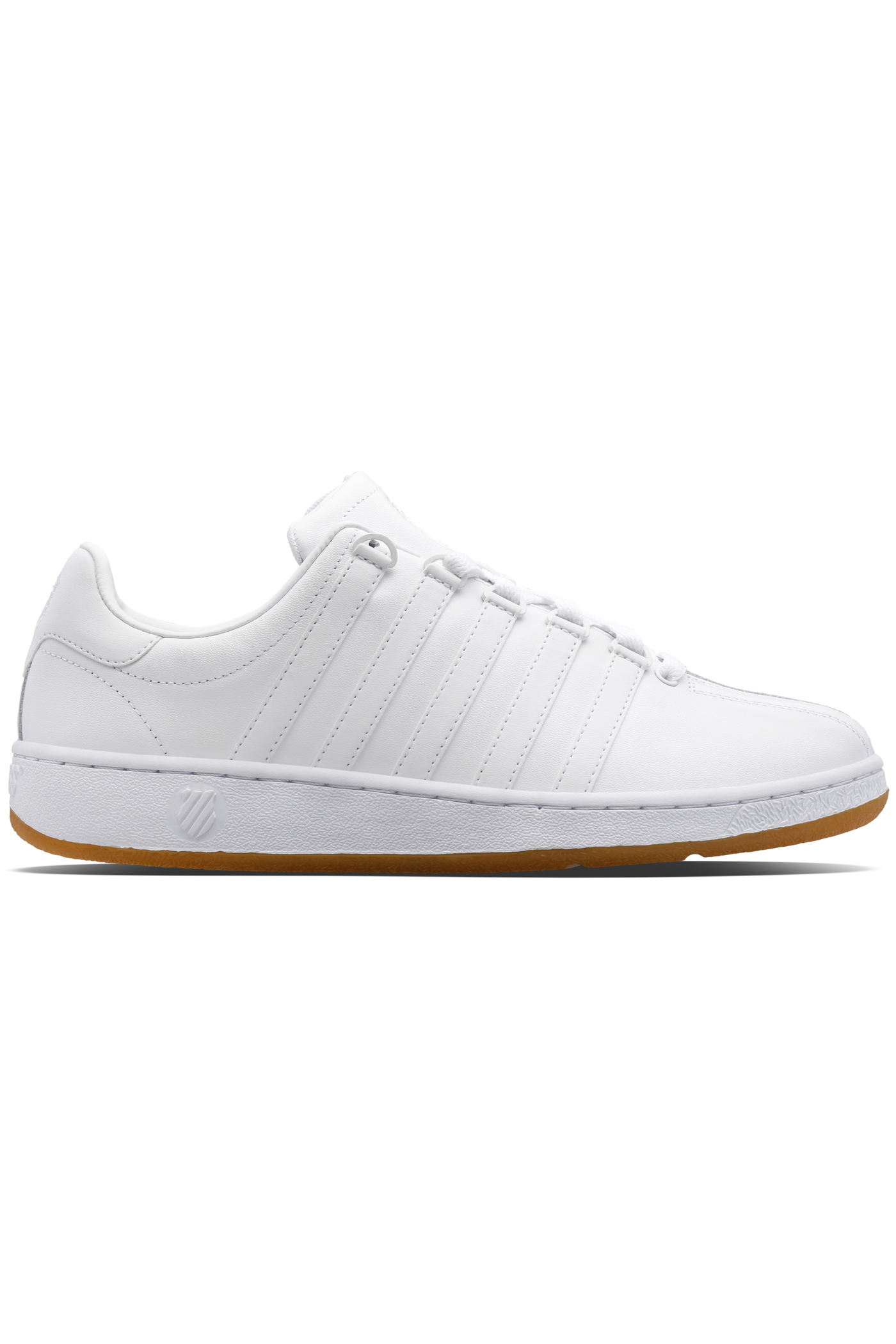 K-Swiss was founded in 1966 when two Swiss brothers. Art and Ernie Brunner. moved to California to create a footwear brand focused on tennis. As avid skiers and tennis players. the brothers took inspiration from leather ski boots to create a court shoe that supported the aggressive side-to-side movements of tennis. The result was the K-Swiss Classic. the first all-leather tennis shoe manufactured in Los Angeles. California. Almost 60 years later that innovation is still the most recognized and bestselling style in our company and has achieved iconic status in the sneaker industry. The Classic VN is the 4th generation of the original shoe. It maintains the trademark elements featured on the first design: 5 stripes. D-ring lacing system. 3 piece toe construction and herringbone brick outsole tread. yet offers the addition of a heel tab that allows for a hint of color and our modern logos to represent the contemporary and progressive values of today’s brand. The Up-spec version of the VN modernizes our classic shoe with better materials. increased comfort. and improved sustainability. The upper features more premium full-grain leather. The shoe’s sustainability has improved by way of the addition of recycled PET linings and laces. internal components made using recycled ocean plastics. and more eco-friendly foam materials in the sock liner and internal midsole. Born out of innovation. the Classic has evolved into a statement of timeless simple design. an expression of our passion for quality and craftsmanship. and an enduring symbol of our authentic tennis heritage.