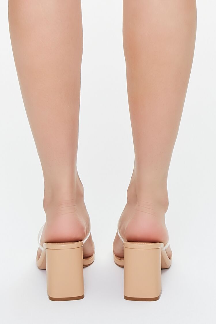 A pair of heels featuring a faux leather insole. open square toe. clear vamps. slip-on styling. and a high block heel.
