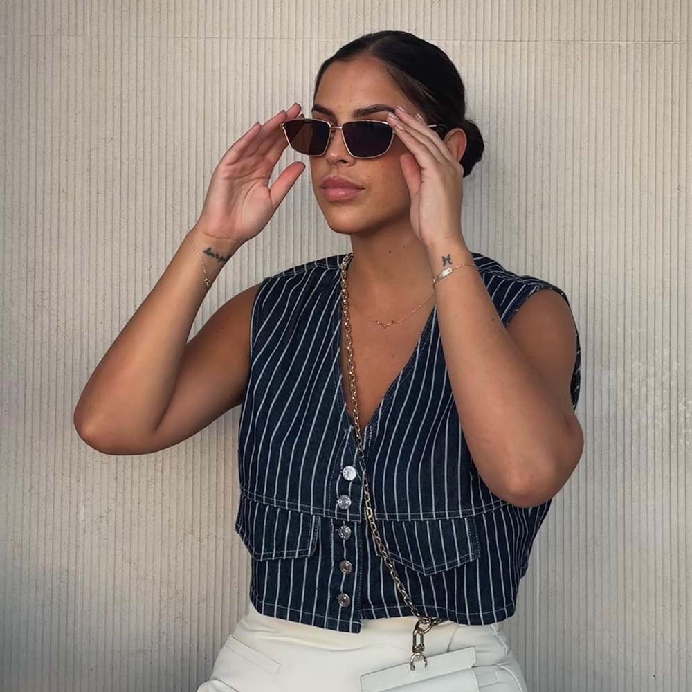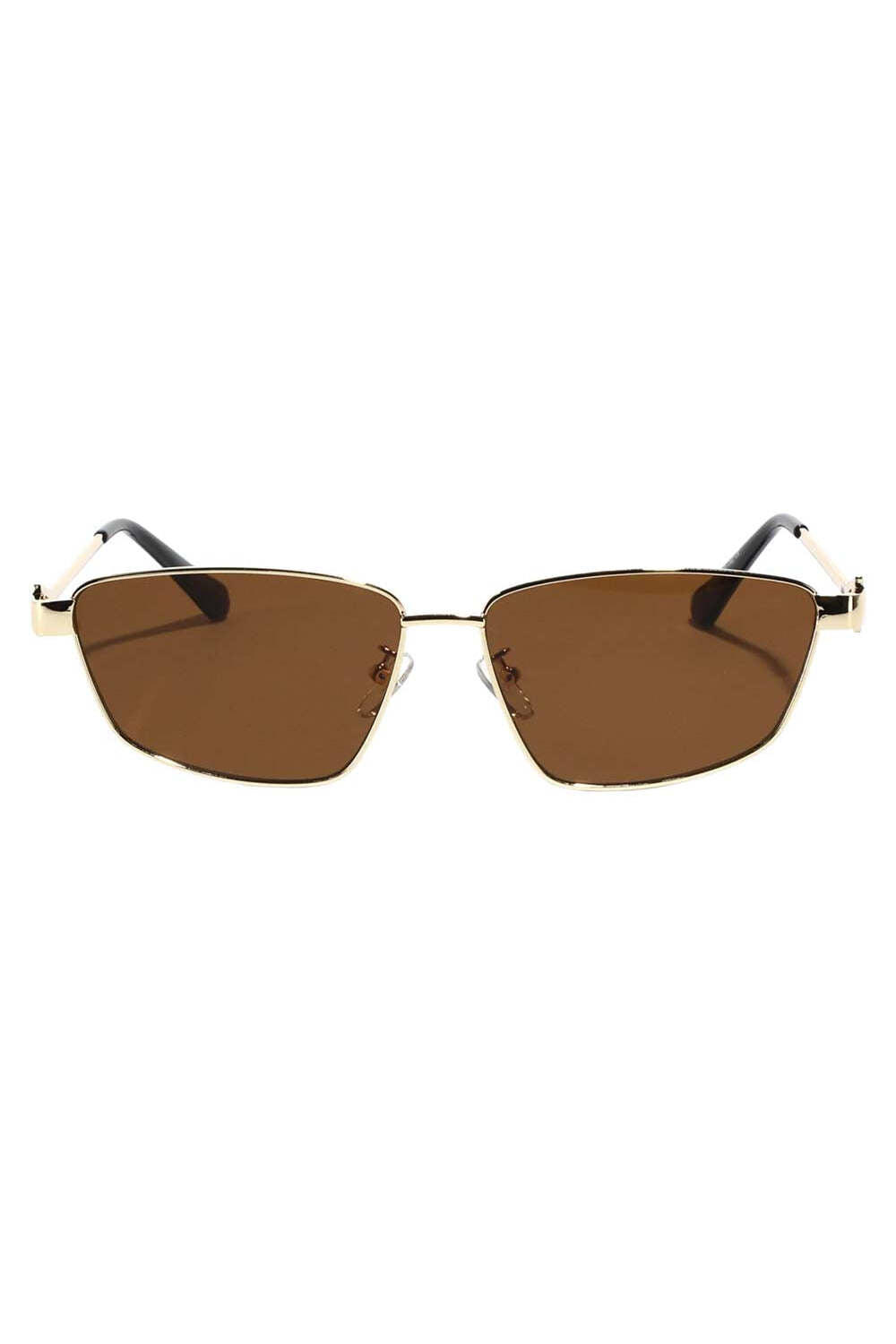 Cleo Polarized Sunglasses feature a modern rectangular geometric?shape. sleek lightweight?metal frame.?rubberized ear tips. and adjustable nose pads for ultimate comfort.?Available in brown/gold. black/gold. and black/black.?