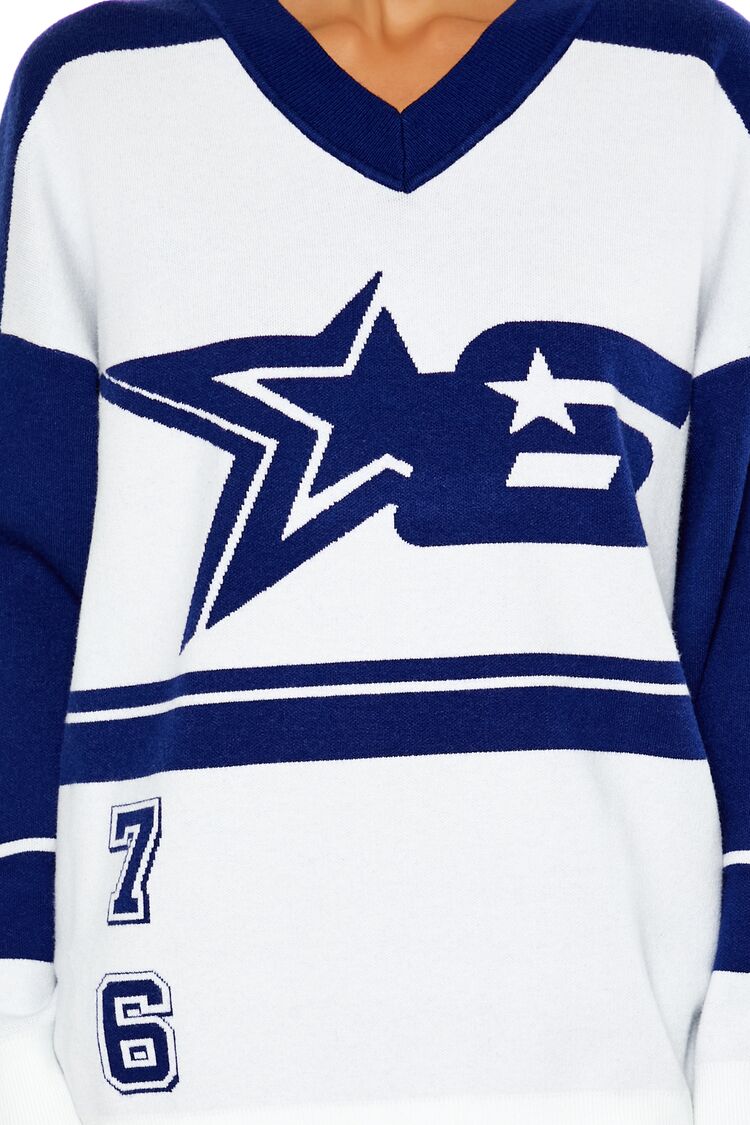A knit sweater featuring a colorblock construction. front star and ‘6’ design. dropped long sleeves. a V-neckline. and striped trim.