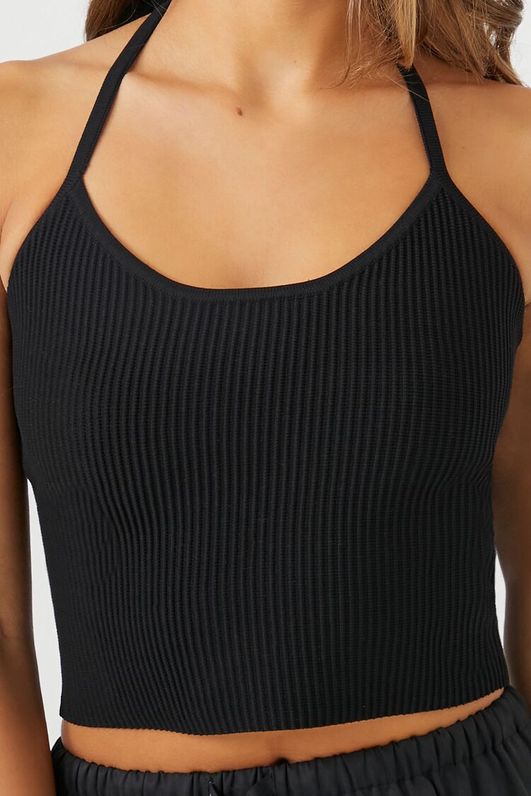 A compact ribbed knit cami featuring a sweater-knit construction. halter neckline with a self-tie closure. and a cropped hem.
