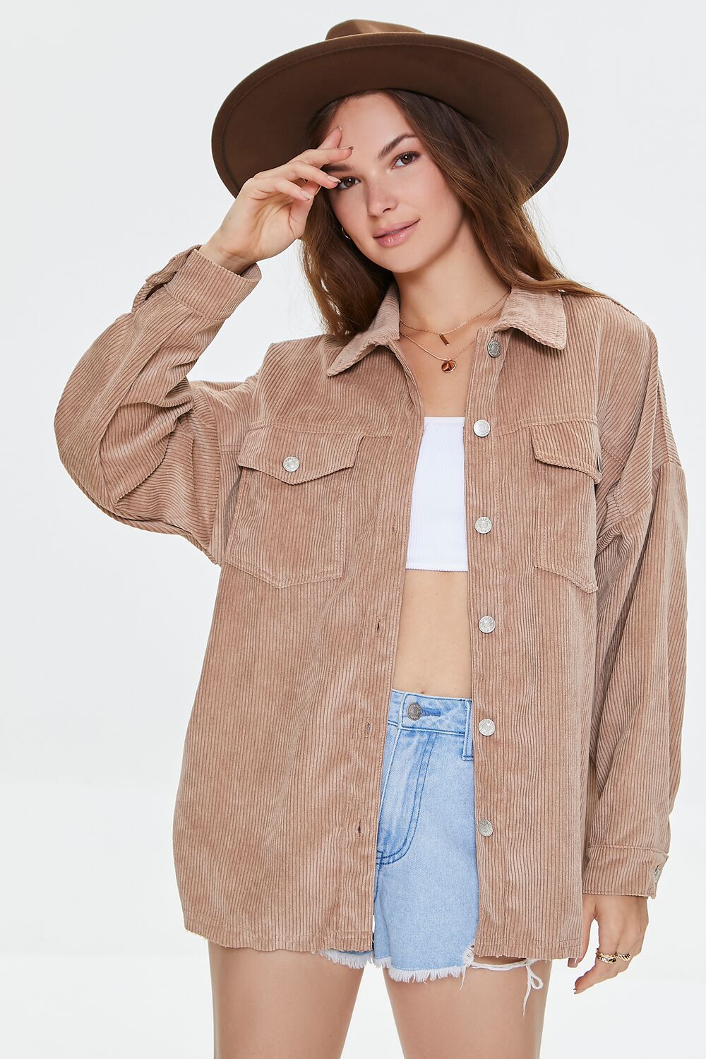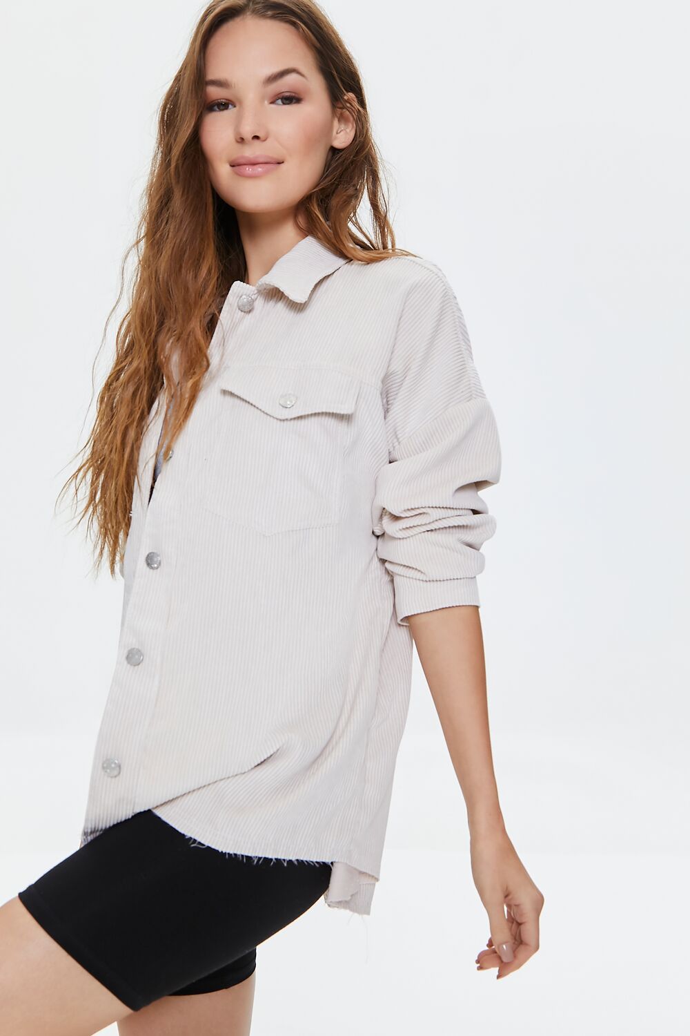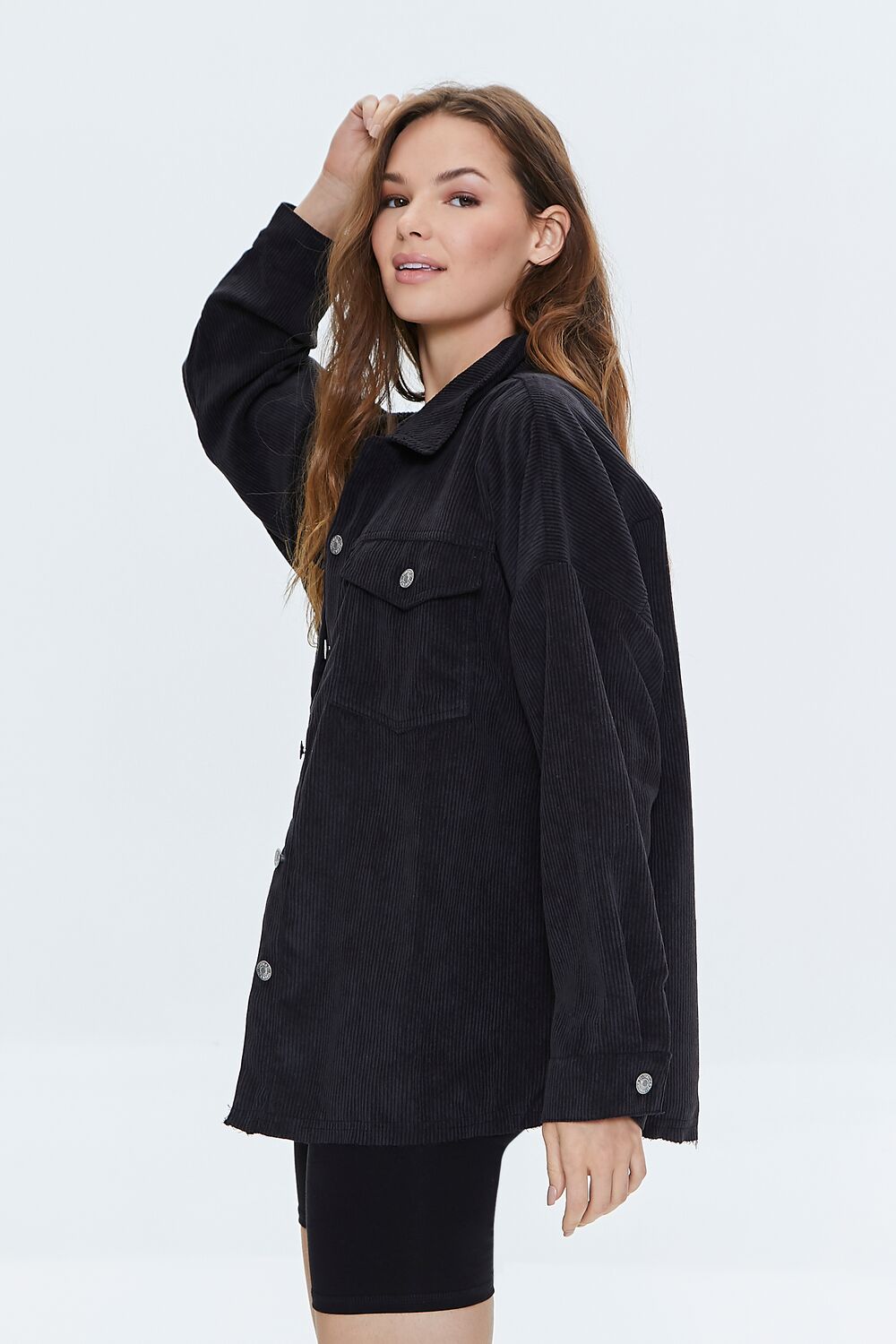 A corduroy shacket featuring a basic collar. button closures on the chest flap pockets and front. dropped long sleeves. and a frayed hem. (This item runs large. please size down.)
