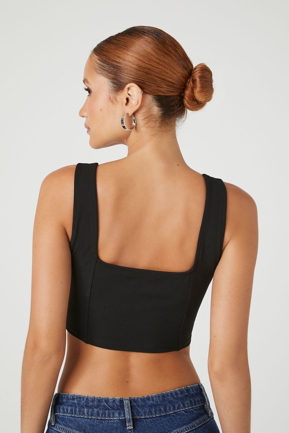 A knit crop top featuring a square-cut neckline and back. shoulder straps. and a corset-inspired seamed construction.