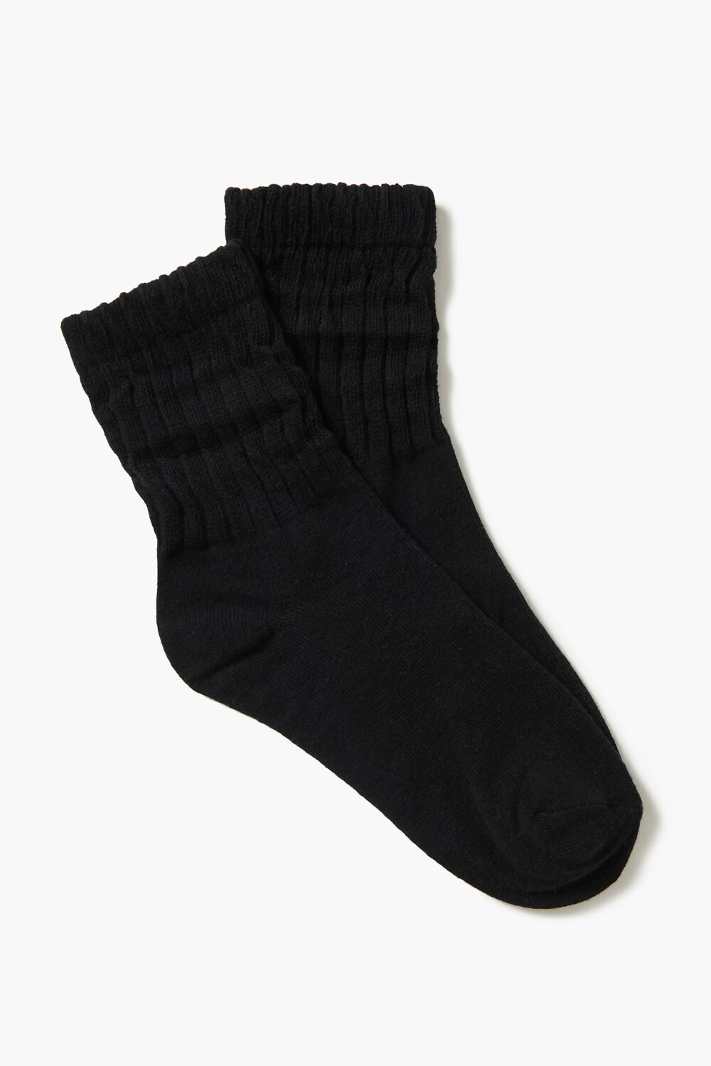 A pair of ribbed knit crew socks featuring a partially crinkled construction.