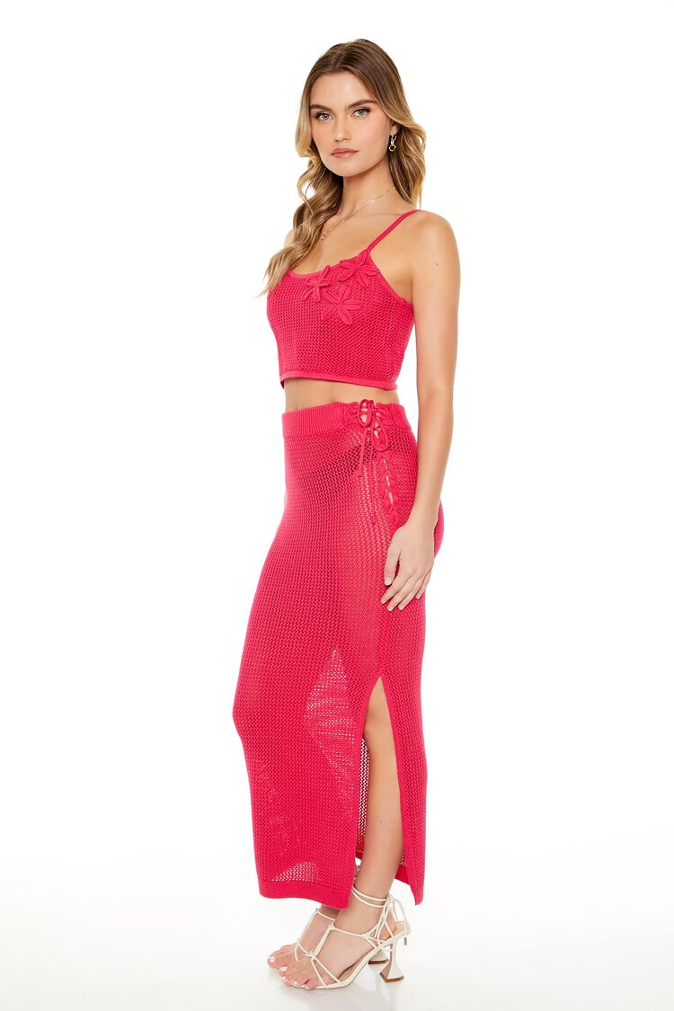 A crochet maxi skirt featuring a sheer construction. self-tie waist closure. and a leg slit.