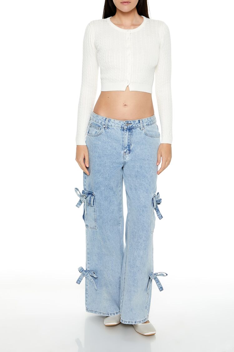 A cable knit cardigan sweater featuring button-front closures. long sleeves. a round neckline. and cropped hem.