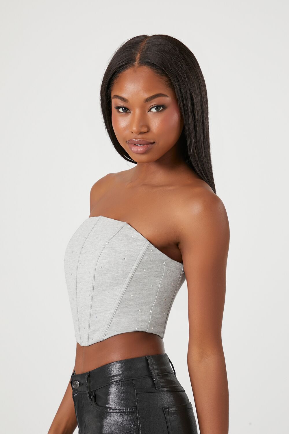 A Ponte knit tube top featuring a corset-inspired design. straight-cut neckline and back. and a curved cropped hem.