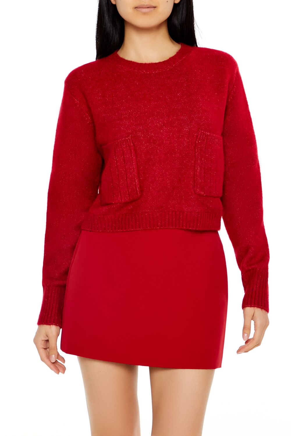 A knit sweater featuring ribbed trim. a crew neck. front patch pockets. long sleeves. and semi-cropped hem.