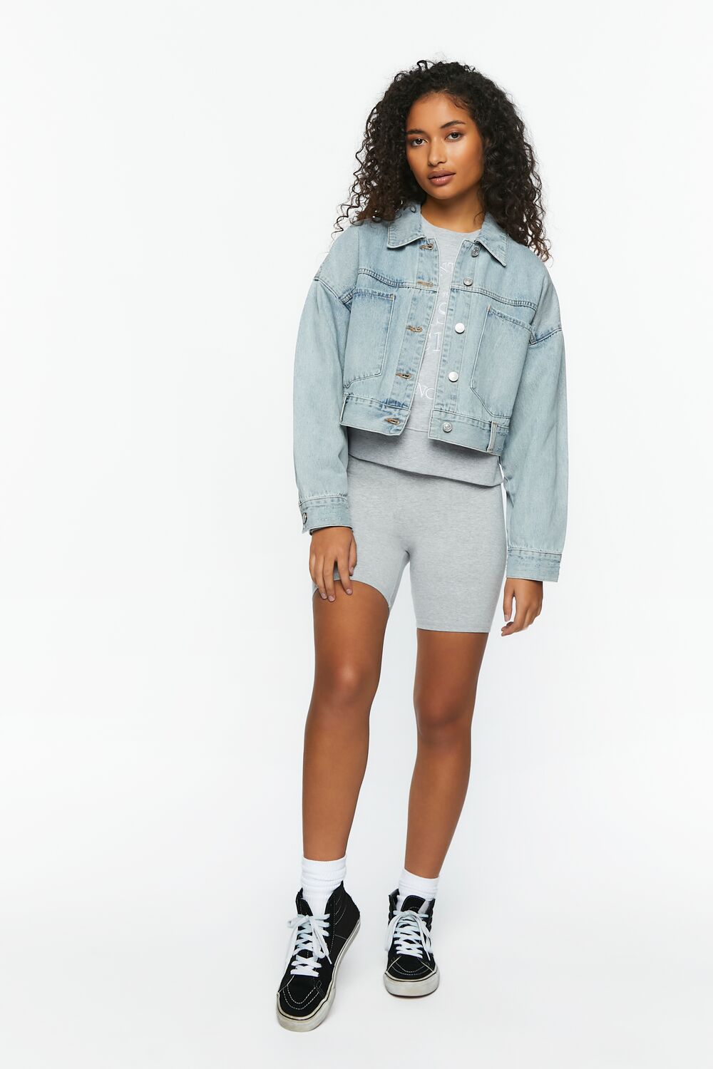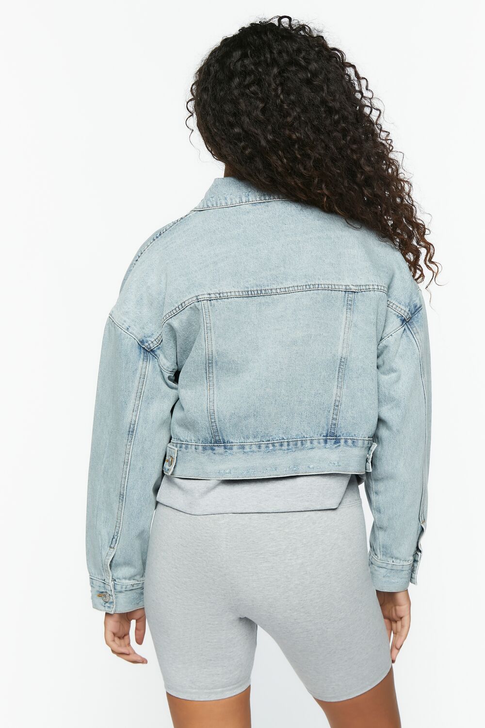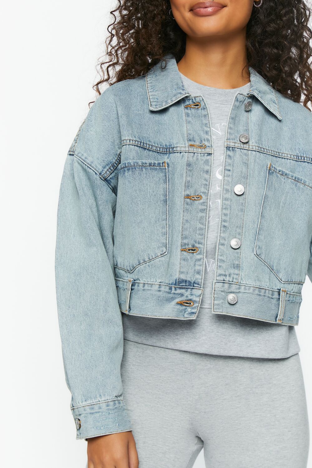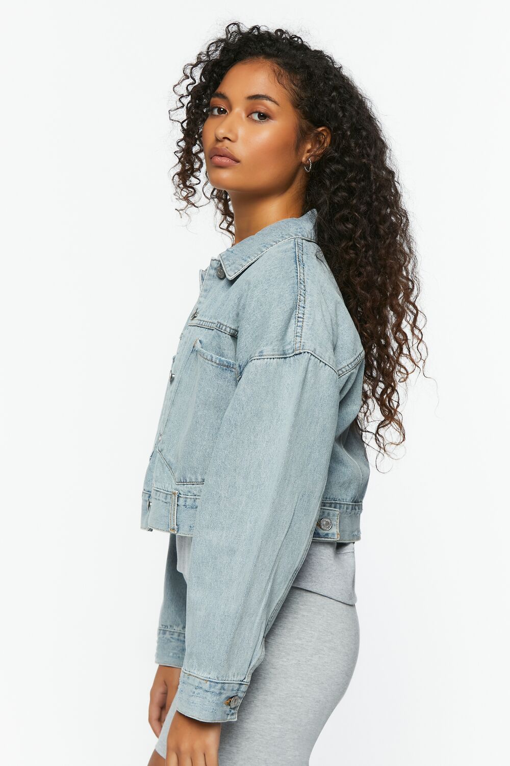 Crafted from non-stretch denim fabric. this jacket features a basic collar. button-front closures. front patch pockets. dropped long sleeves with buttoned cuffs. belt loops. waist tabs. contrast topstitching. and cropped hem.
