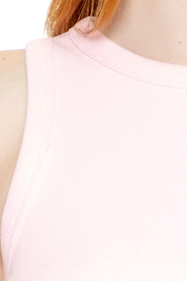 A ribbed knit tank top featuring a round neckline. dolphin hem. and a cropped silhouette.