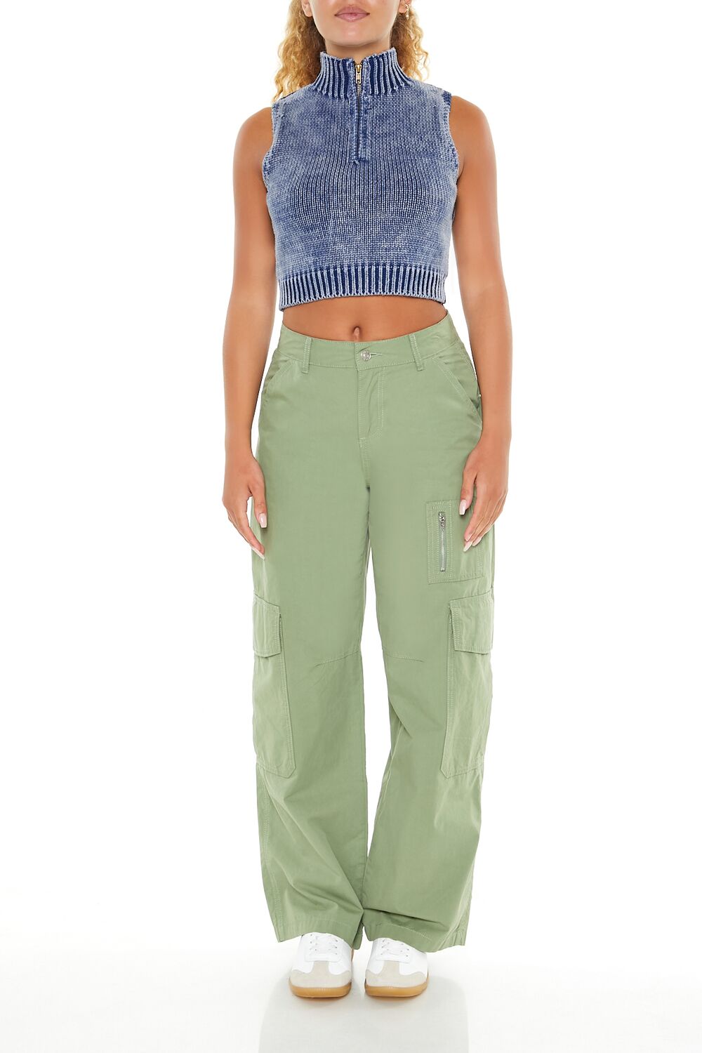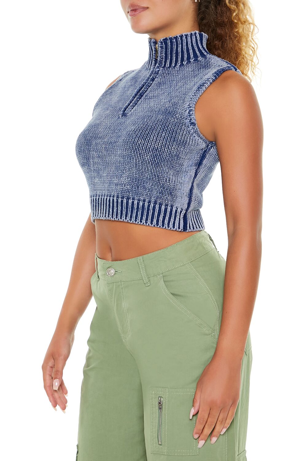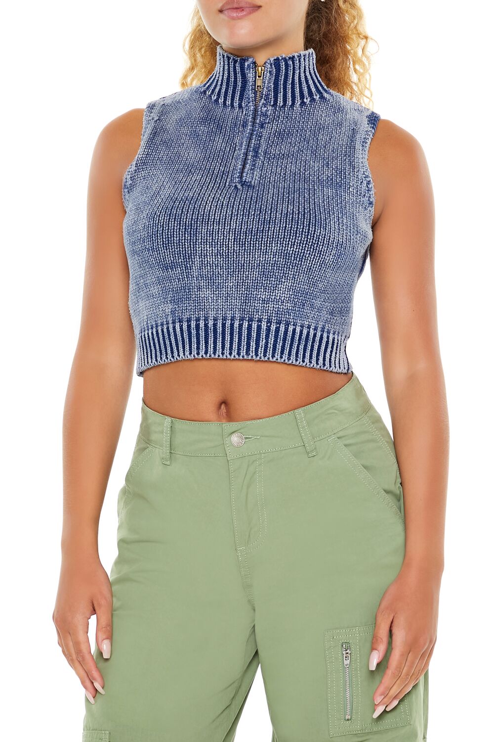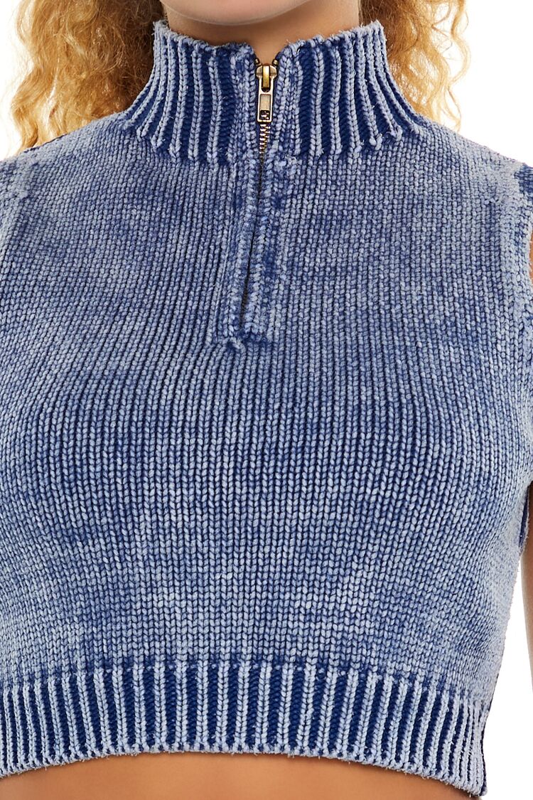 A knit sweater vest featuring ribbed trim. an allover mineral wash. mock neck. half-zip closure. and a cropped hem.