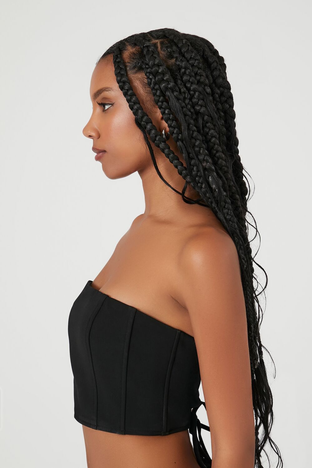 A woven tube top featuring a straight-cut neckline and back. lace-up back. and cropped hem.