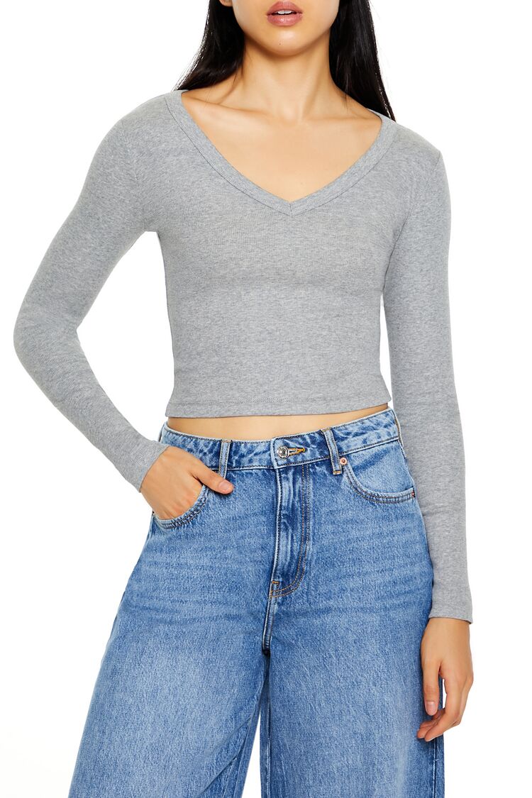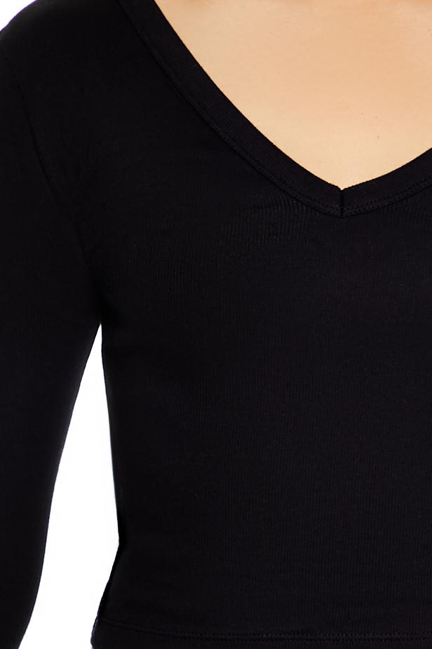A knit top featuring a V-neckline. long sleeves. fitted silhouette. and a cropped hem.
