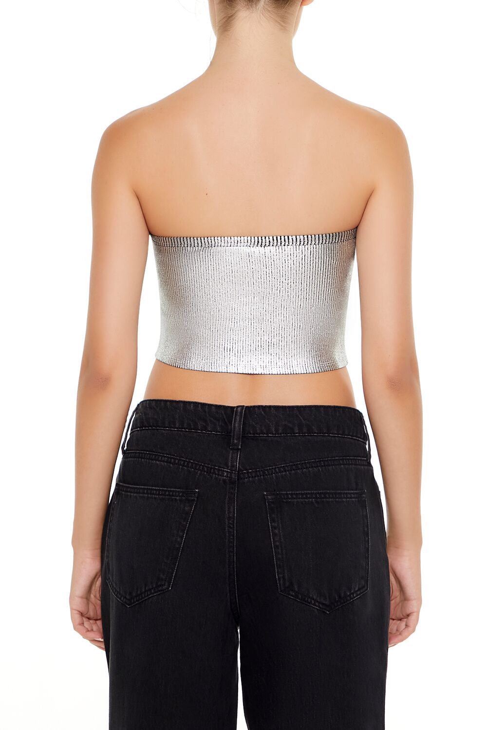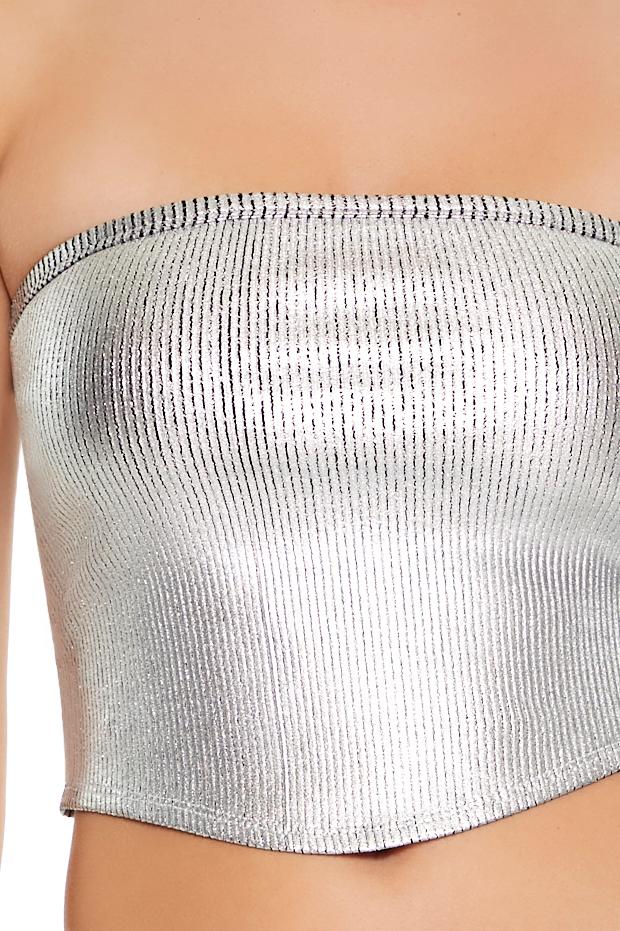 A metallic knit tube top featuring a straight-cut neckline and back. ribbed trim. and a curved reverse high-low hem.