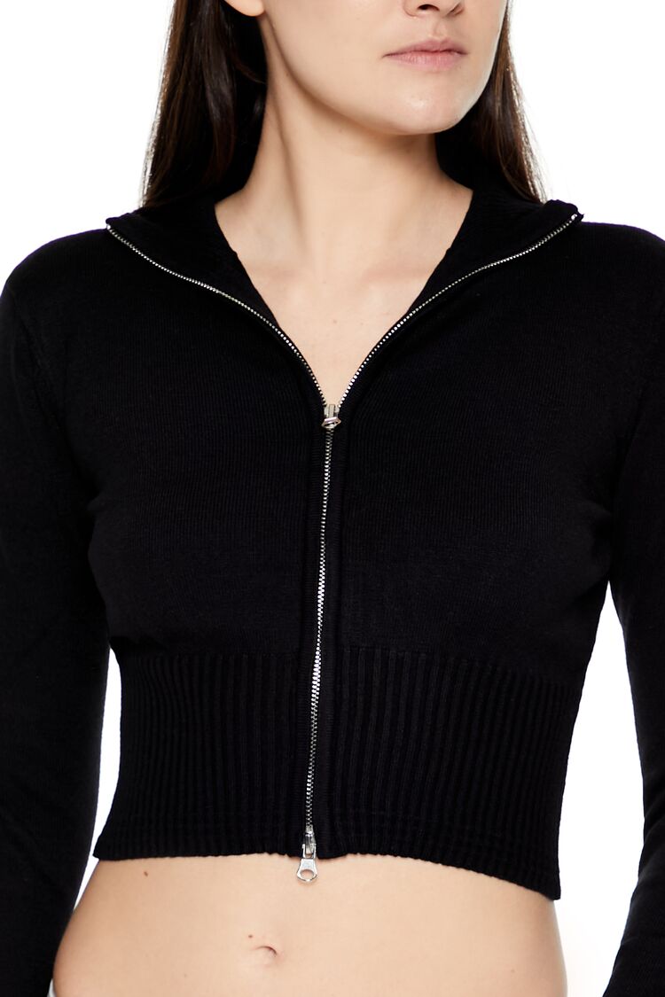 A knit sweater featuring a zip-up front closure. long sleeves. ribbed trim. a funnel neck. and cropped hem.