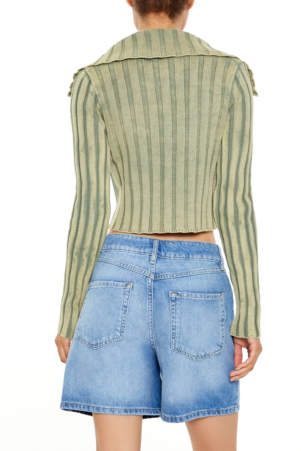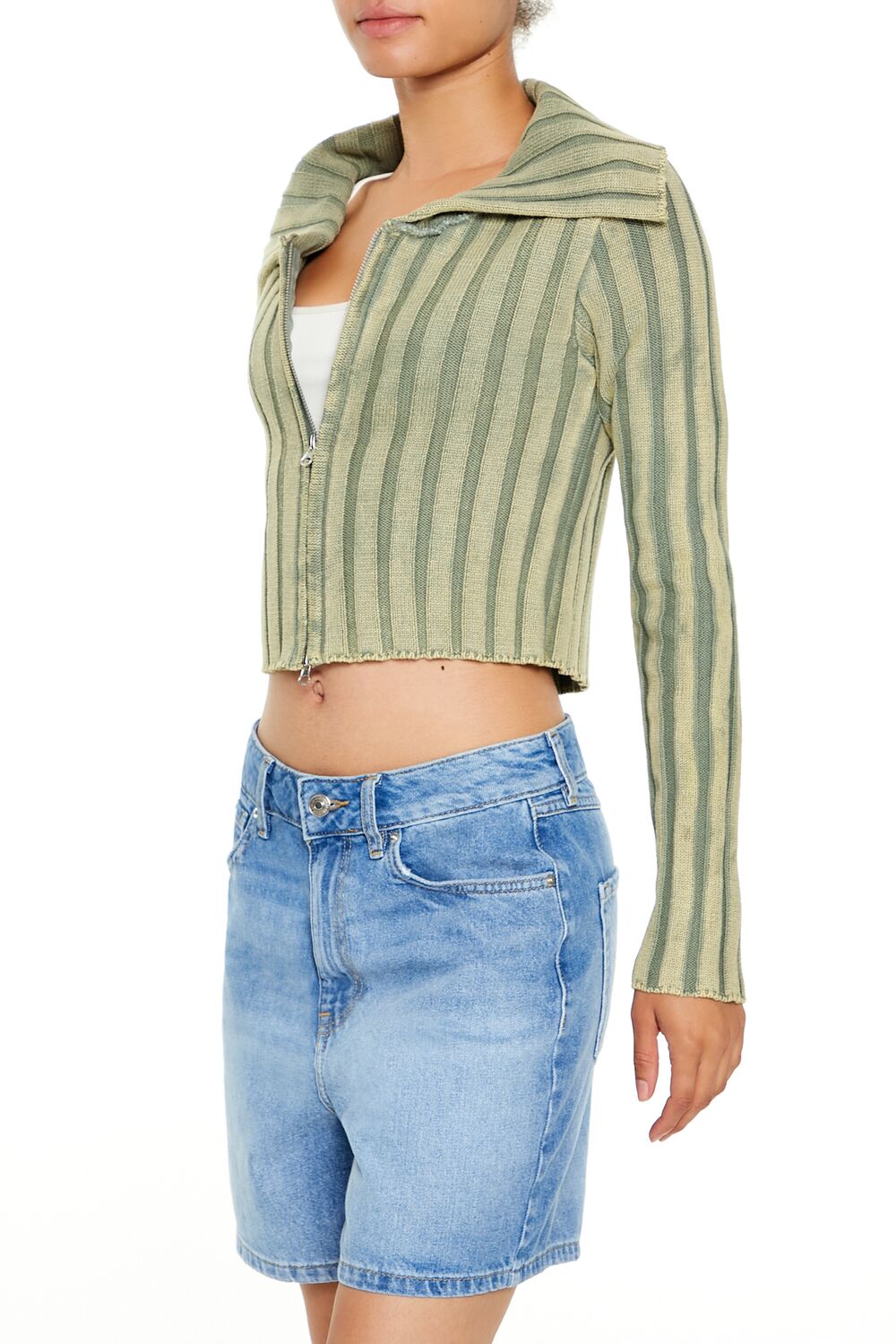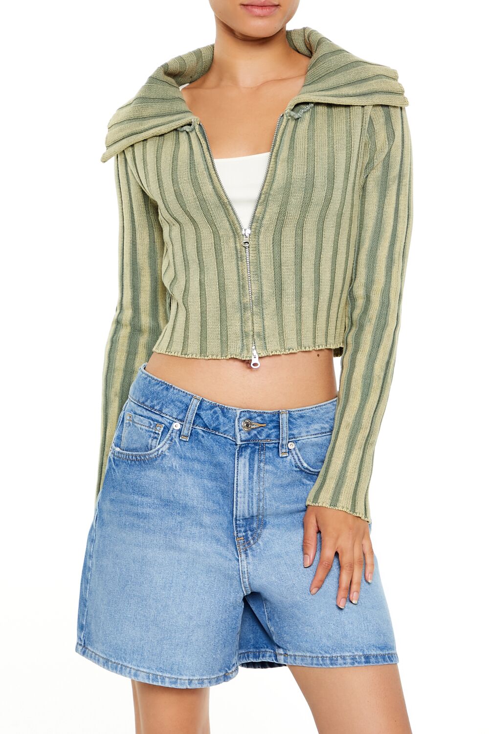 A wide-ribbed knit sweater featuring a zip-up closure. mineral wash. long sleeves. funnel neck. and a cropped hem.