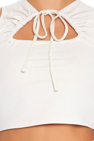 A jersey knit crop top featuring a drawstring cutout. high neckline. and sleeveless cut.