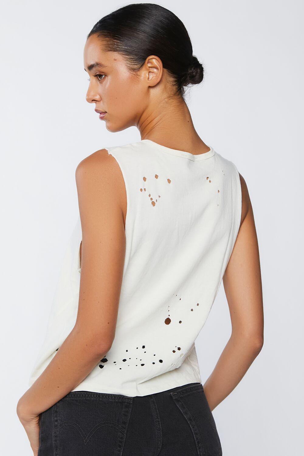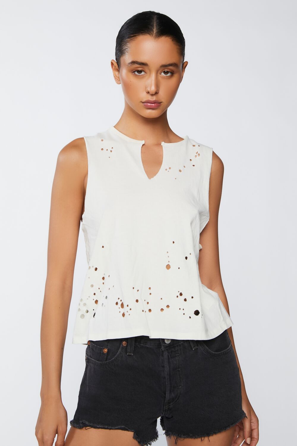A knit muscle tee featuring allover distressing. a split neckline. and raw-cut trim.