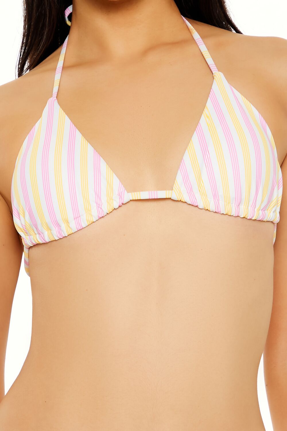 A knit essential bikini top featuring a triangle silhouette. string construction. allover multi-striped pattern. halter neckline. and dual self-tie back closures.