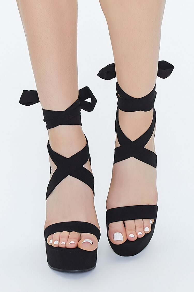 A pair of faux suede heels featuring an open almond toe. wraparound lace-up closures that self-tie in the back. platform. and a high block heel.