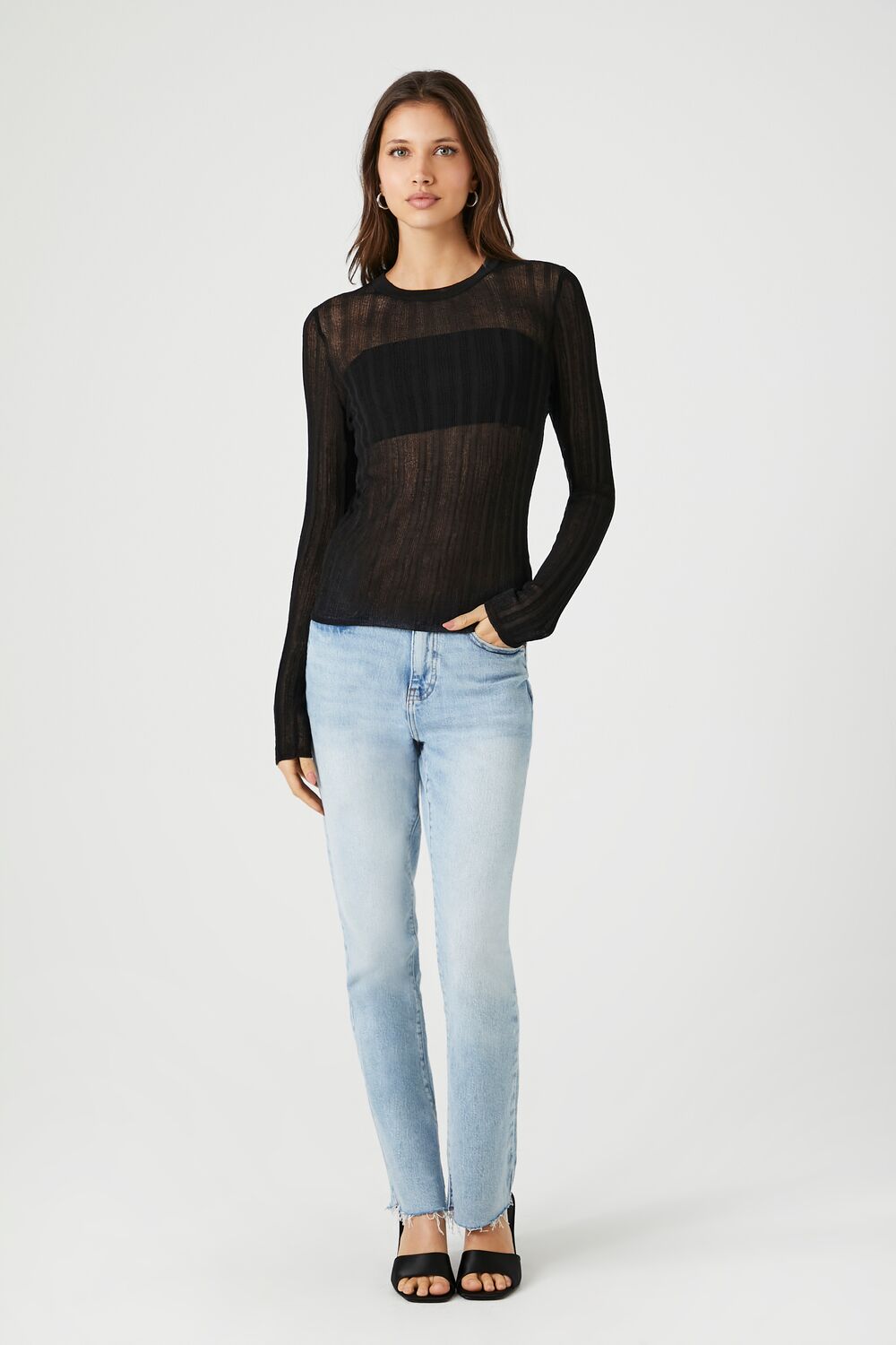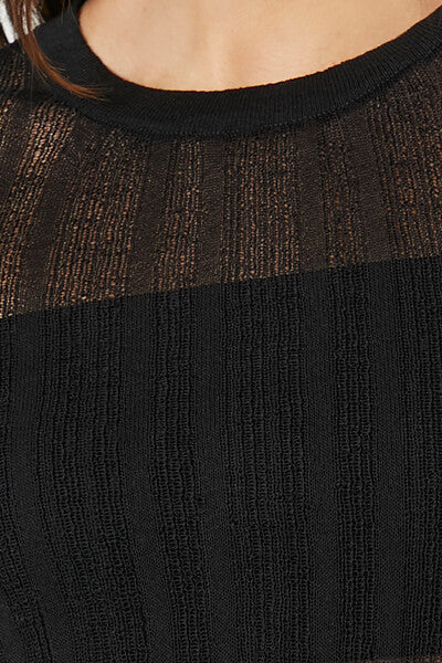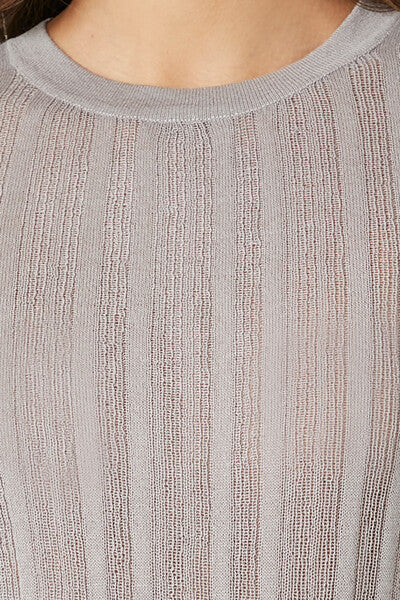 A ribbed knit sweater featuring a round neckline. long sleeves. and a fitted silhouette.
