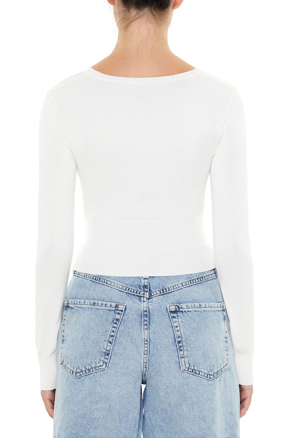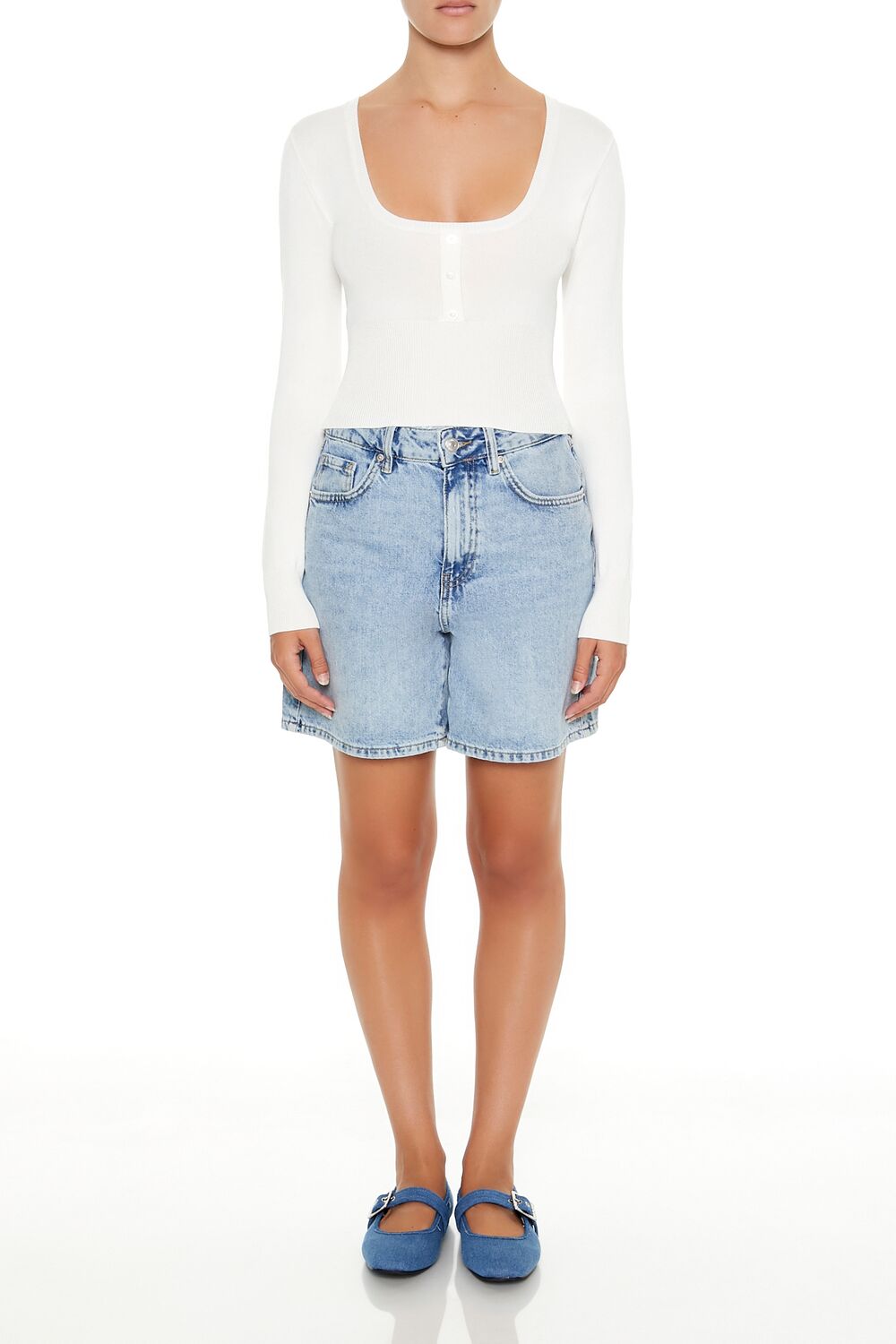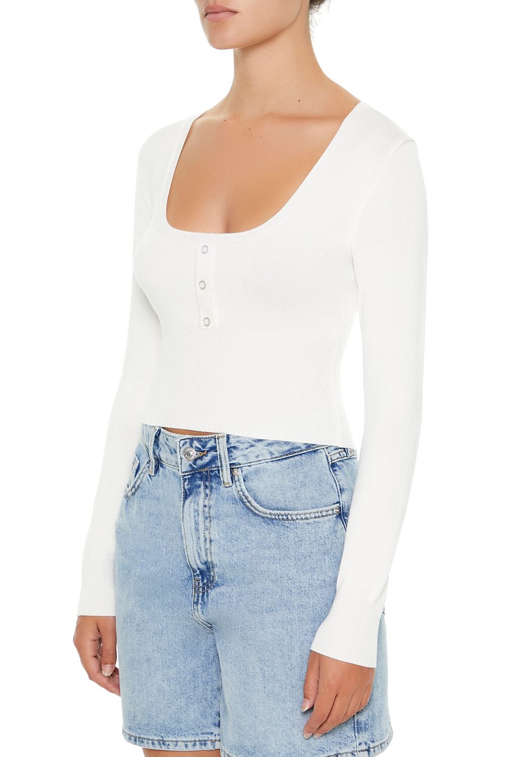 A knit sweater featuring a square-cut neckline. long sleeves. partial button placket. and fitted silhouette.