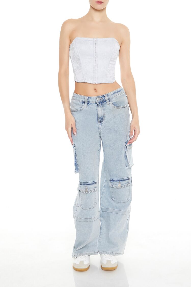 A jacquard woven tube top featuring a straight-cut neckline and back. allover floral print. boning. corset-inspired design. hook-and-eye front closures. and a cropped hem.