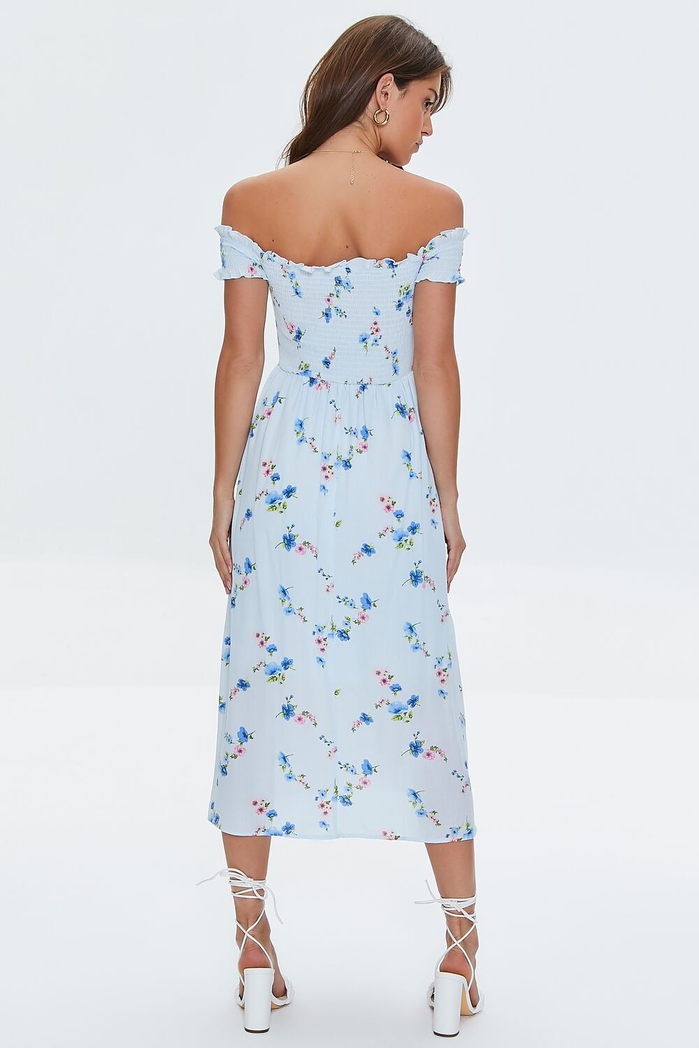 A woven dress featuring an allover floral print. off-the-shoulder neckline. smocked bodice. short sleeves. A-line silhouette. and a midi length.
