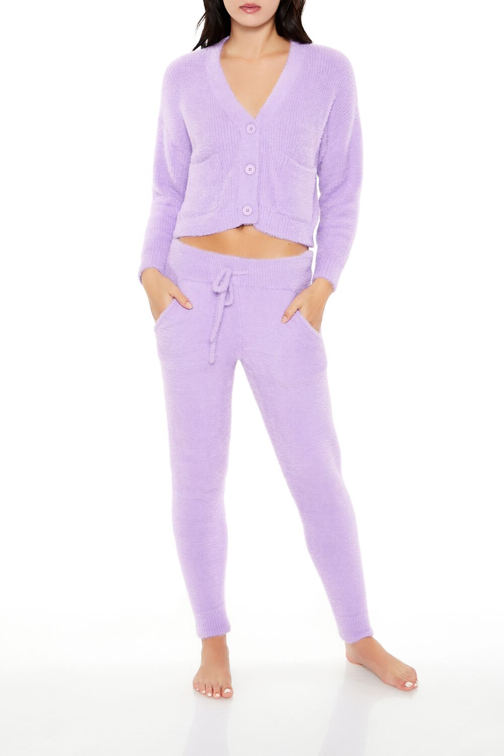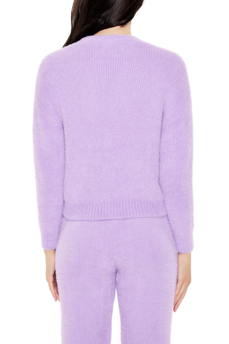 A knit cardigan sweater featuring a fuzzy textured construction. button-front closures. V-neckline. front patch pockets. and long sleeves.