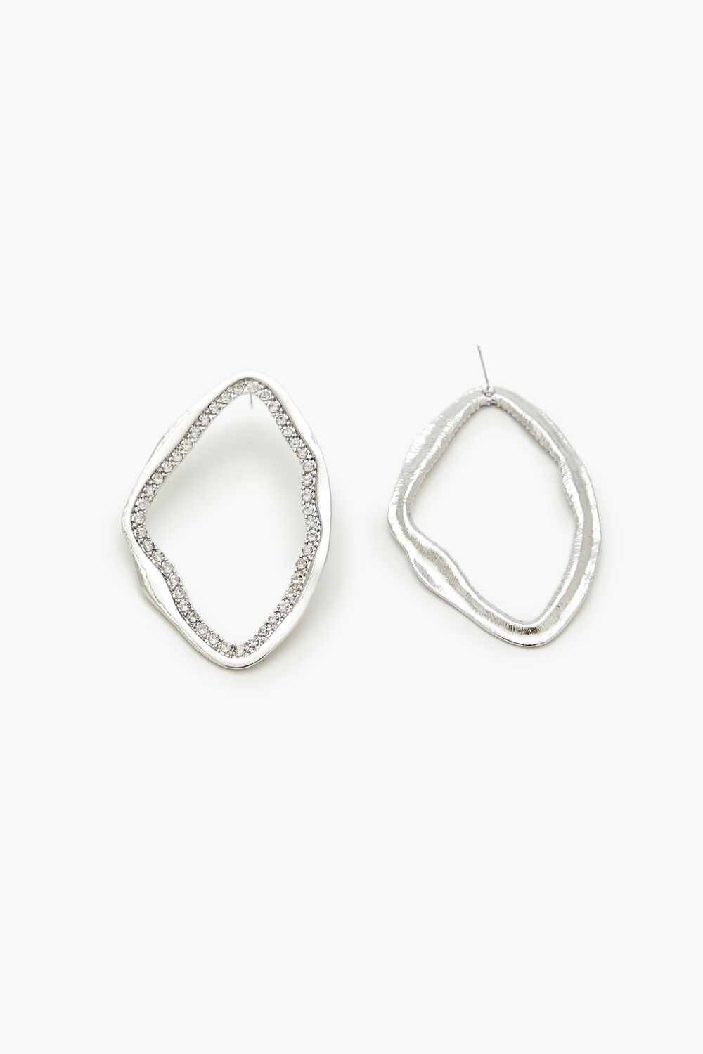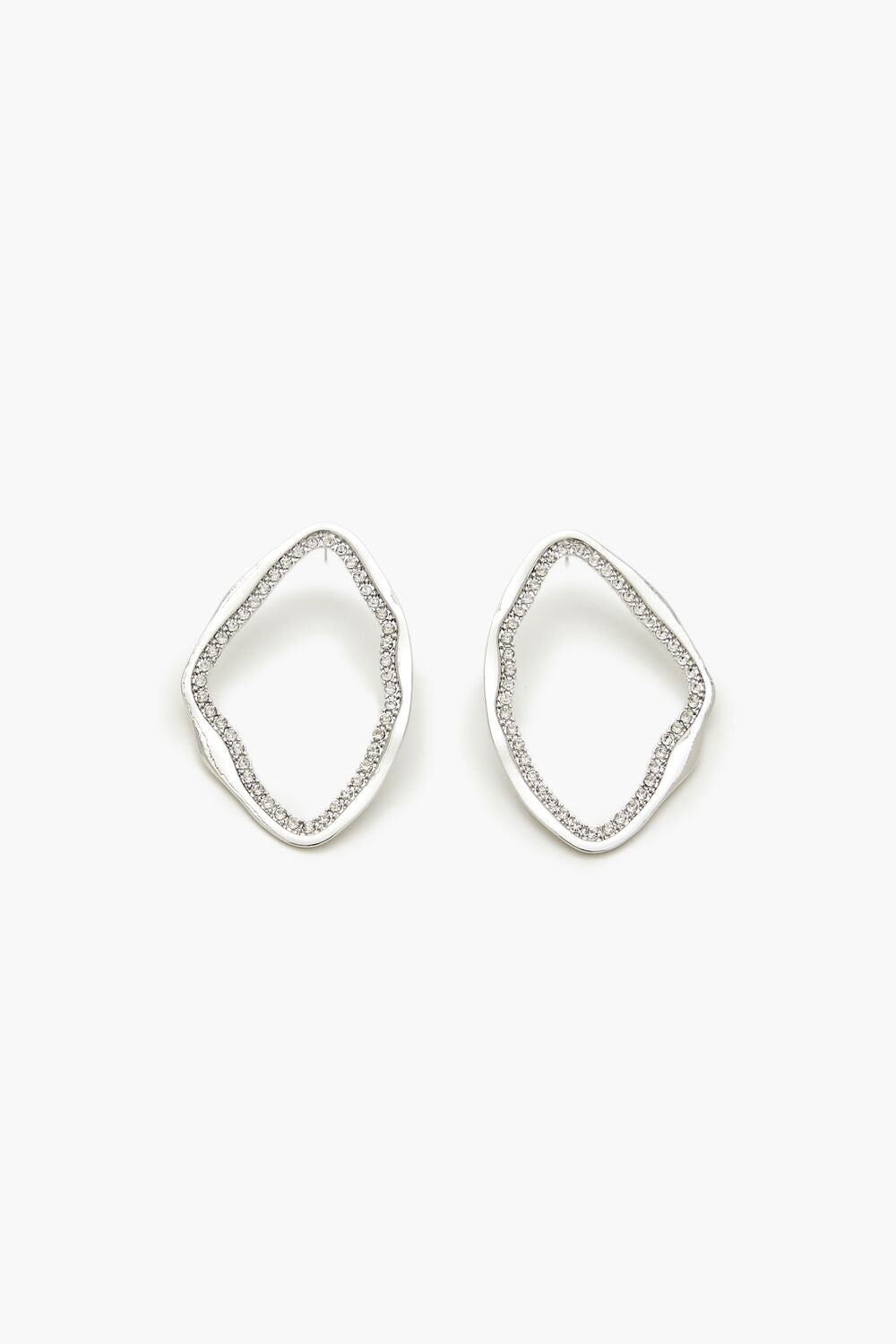 A pair of high-polish drop earrings featuring a geometric construction. organic shape. cutout design. rhinestone trim. and post-back closures.