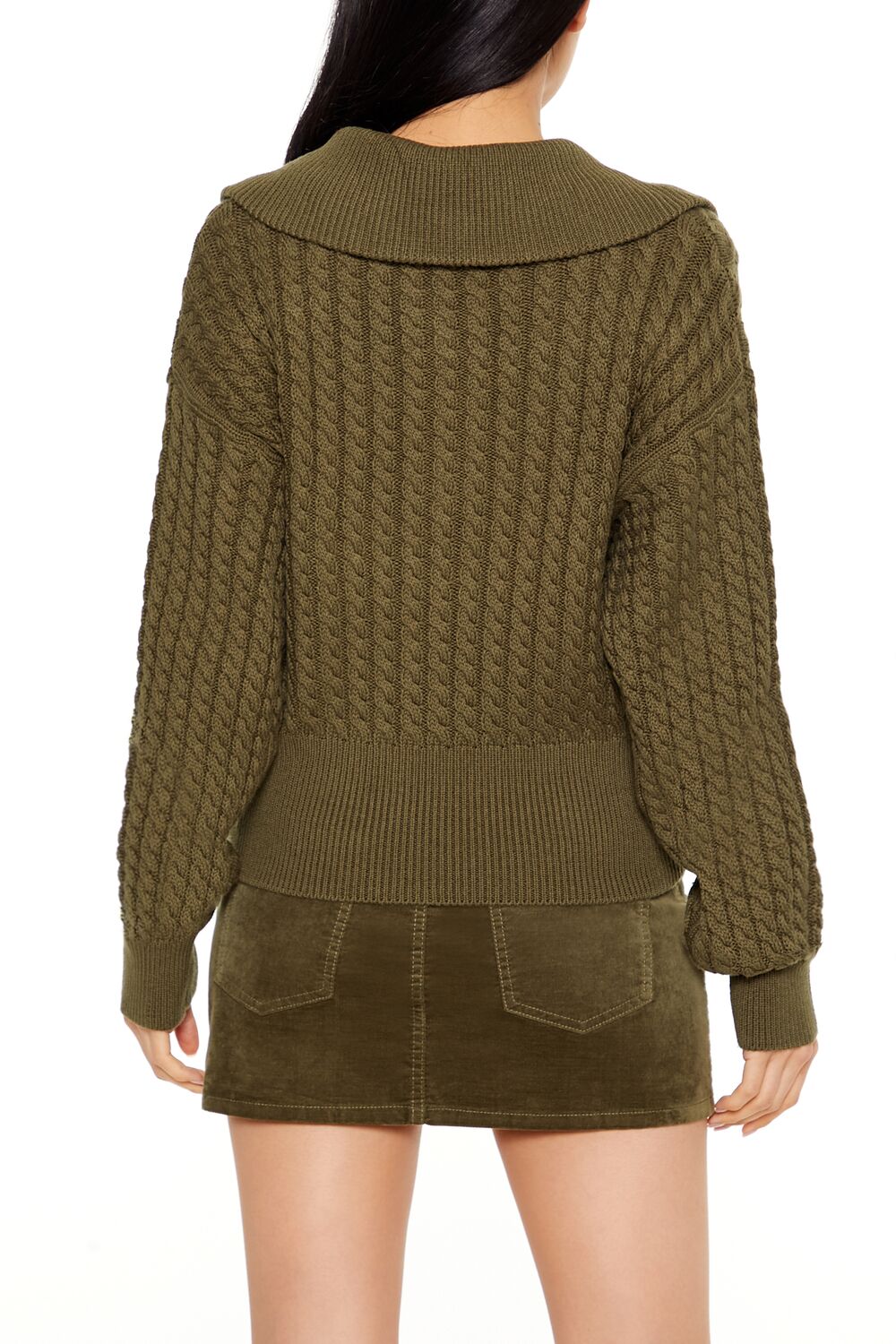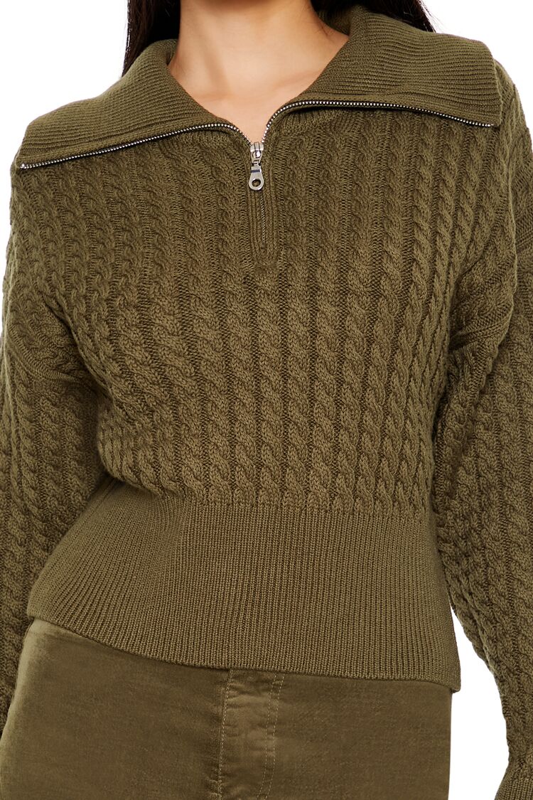 A cable knit sweater featuring a funnel neck. half-zip front closure. dropped long sleeves. and ribbed trim.
