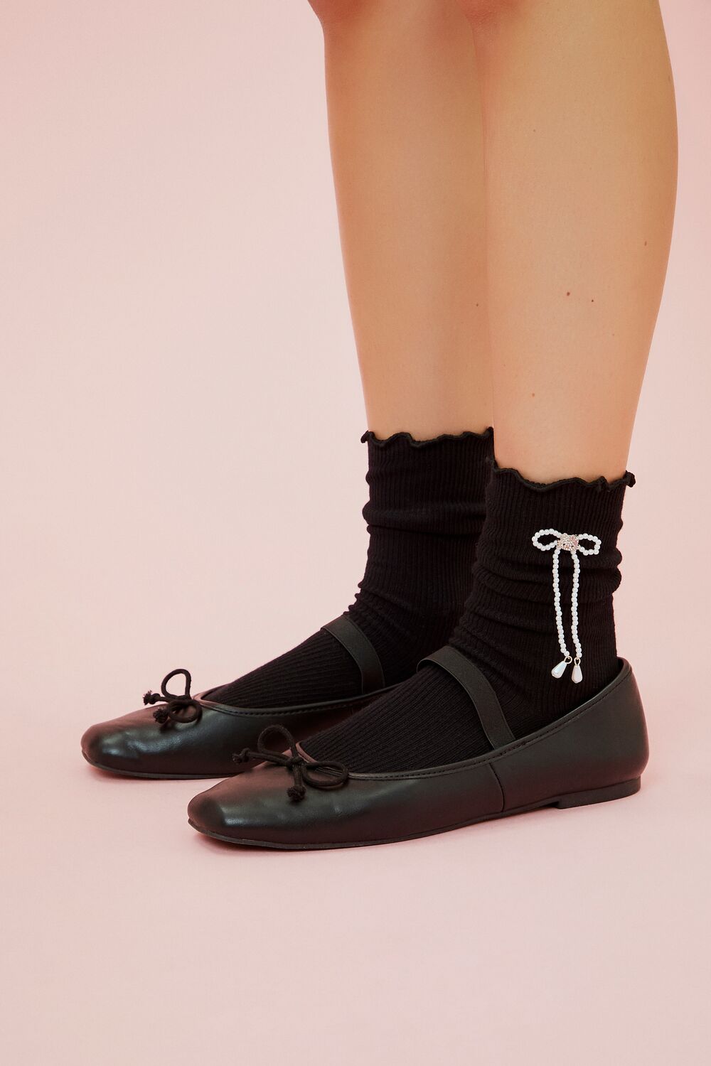 From our Hello Kitty x Forever 21 collection. this pair of ribbed knit crew socks features a bow embellishment with a Hello Kitty design and rhinestones and lettuce-edge trim.