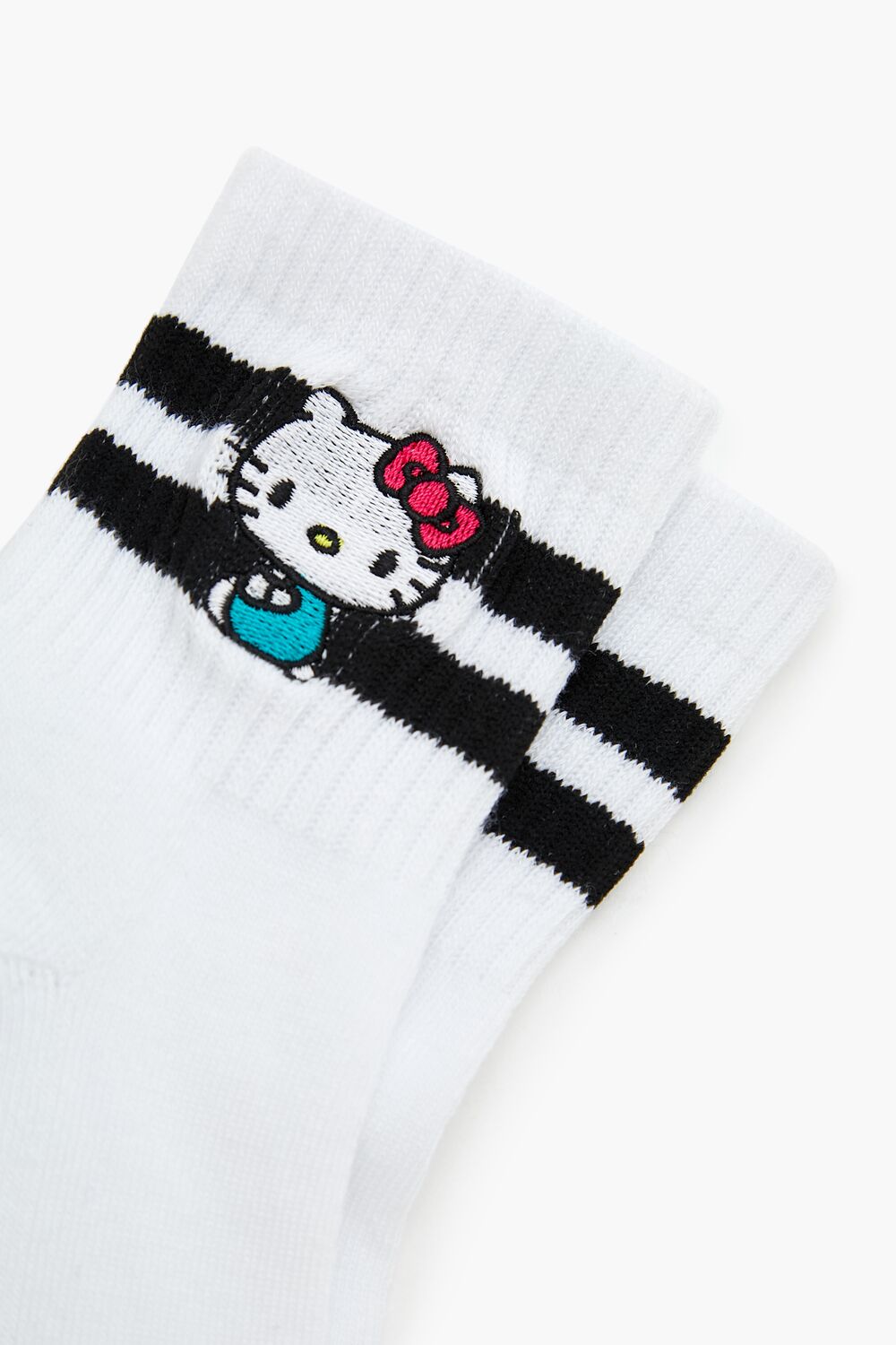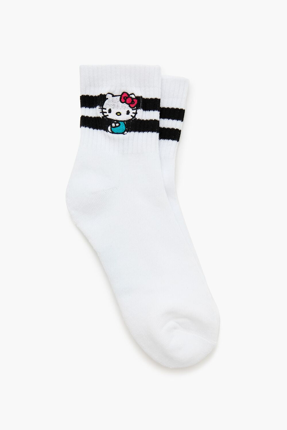 A pair of ribbed knit crew socks featuring varsity-striped trim and Hello Kitty embroidery.
