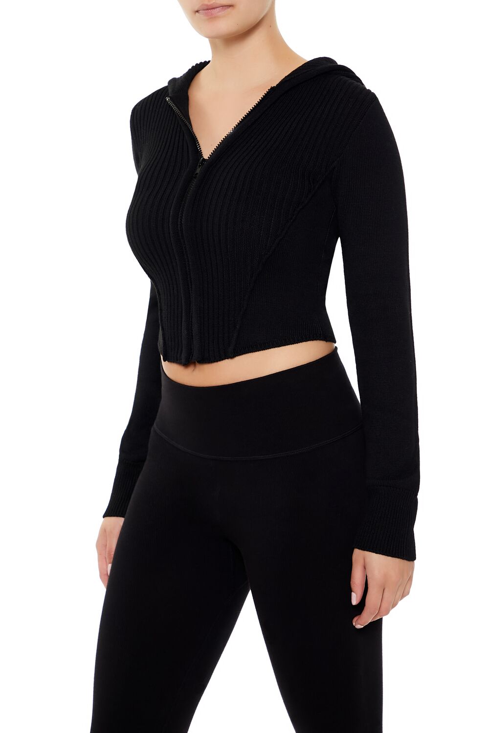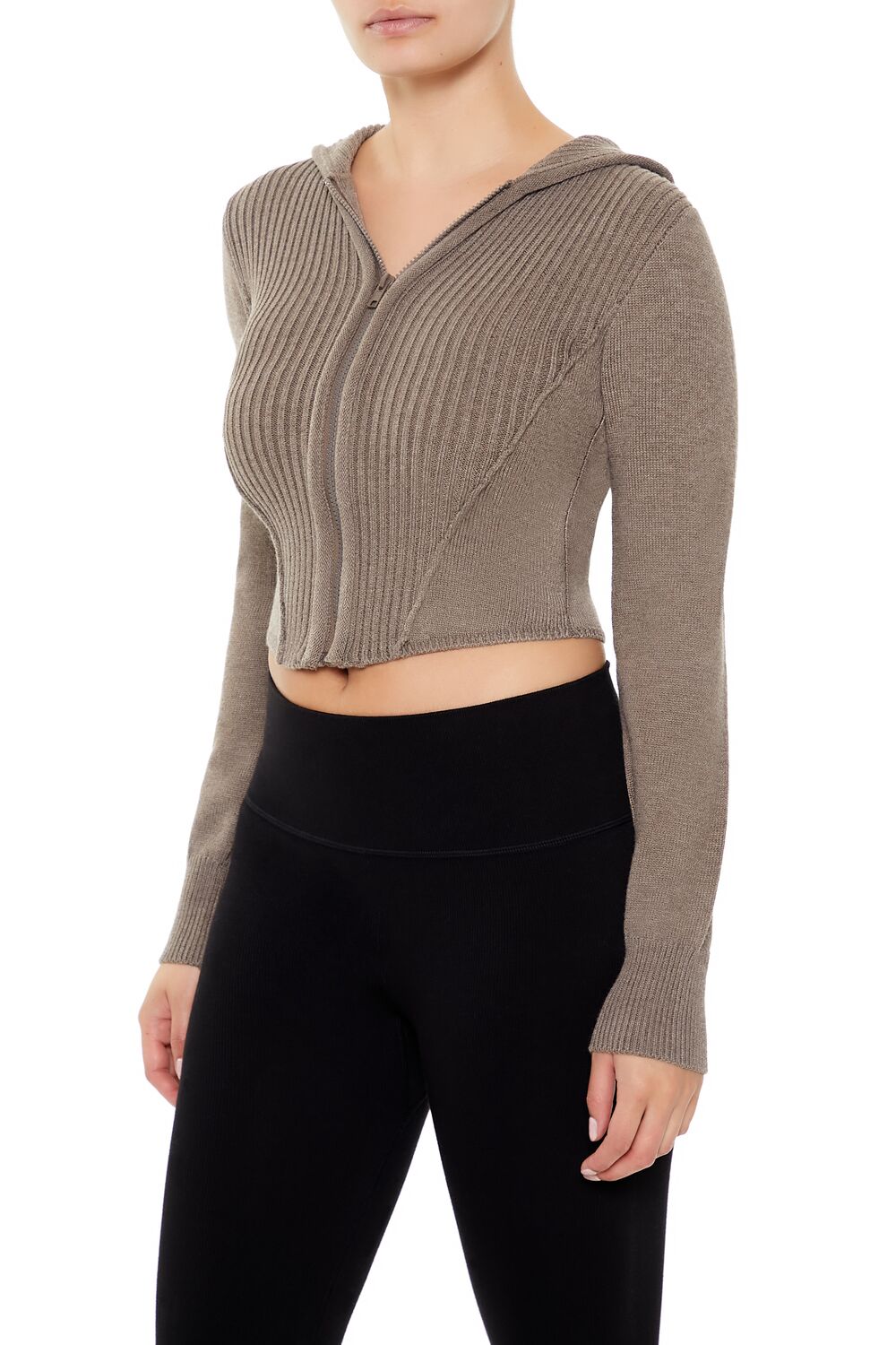 A knit zip-up sweater featuring a hooded construction. long sleeves. and cropped hem.