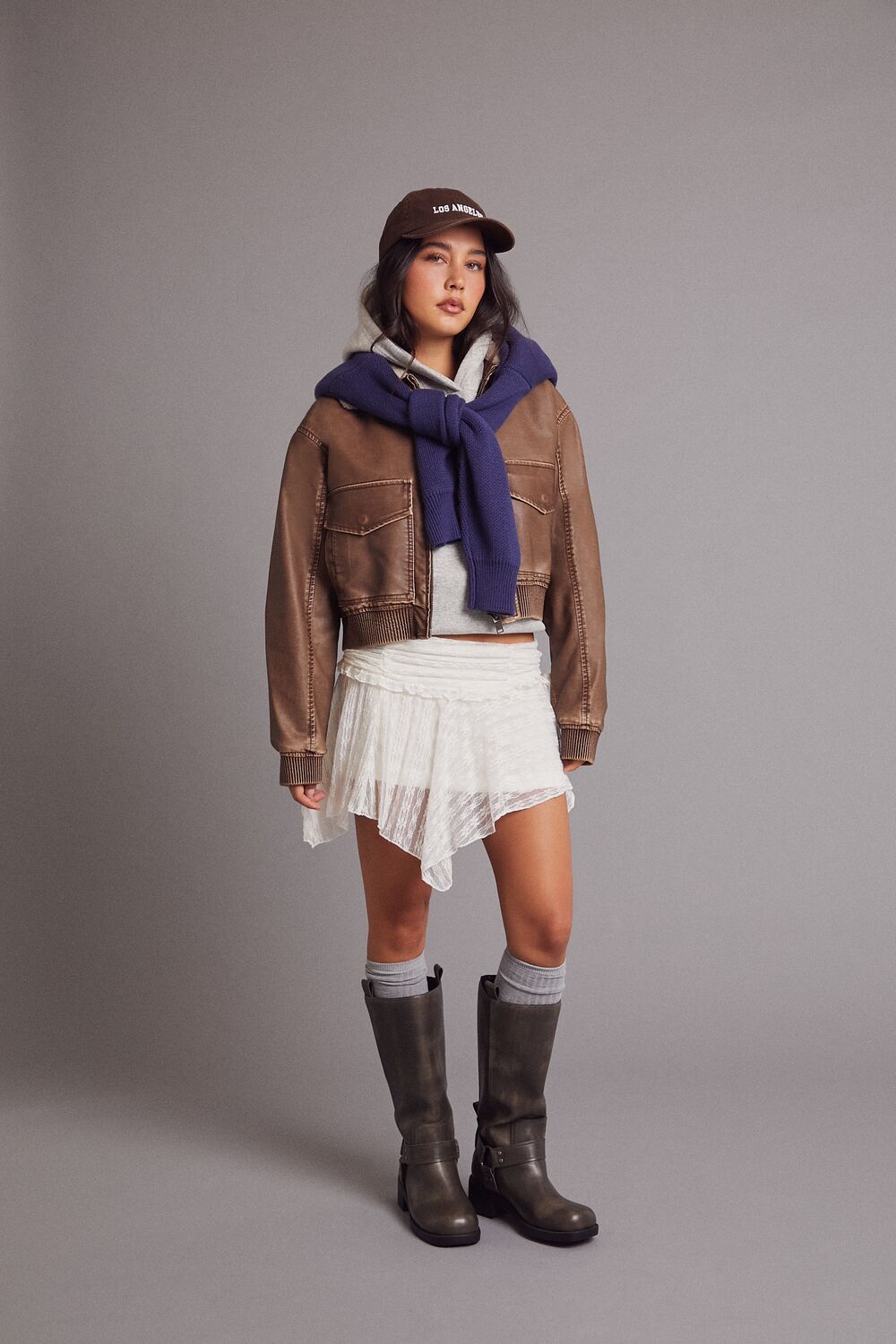 A lace mini skirt featuring lettuce-edge trim. a foldover mid-rise waist. partial lining. handkerchief hem. and flare silhouette.