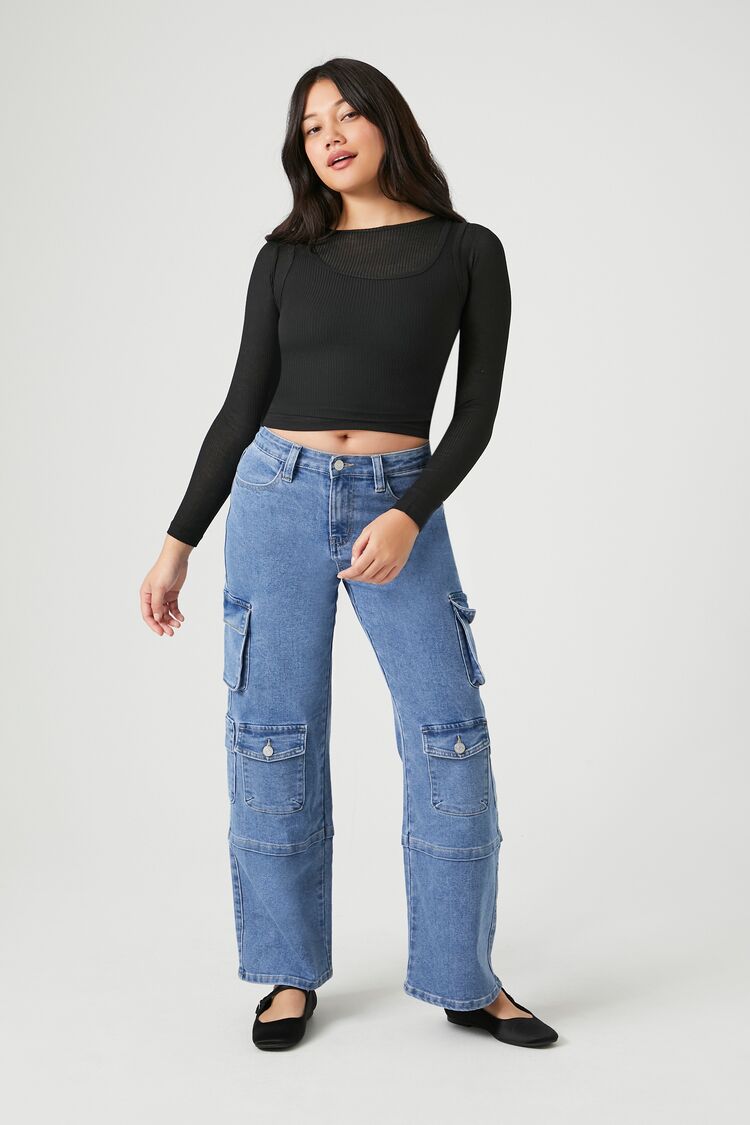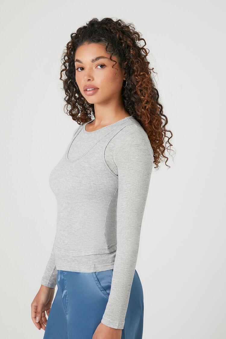 A ribbed knit combo top featuring a round neckline. layered tank design. long sleeves. and a fitted silhouette.