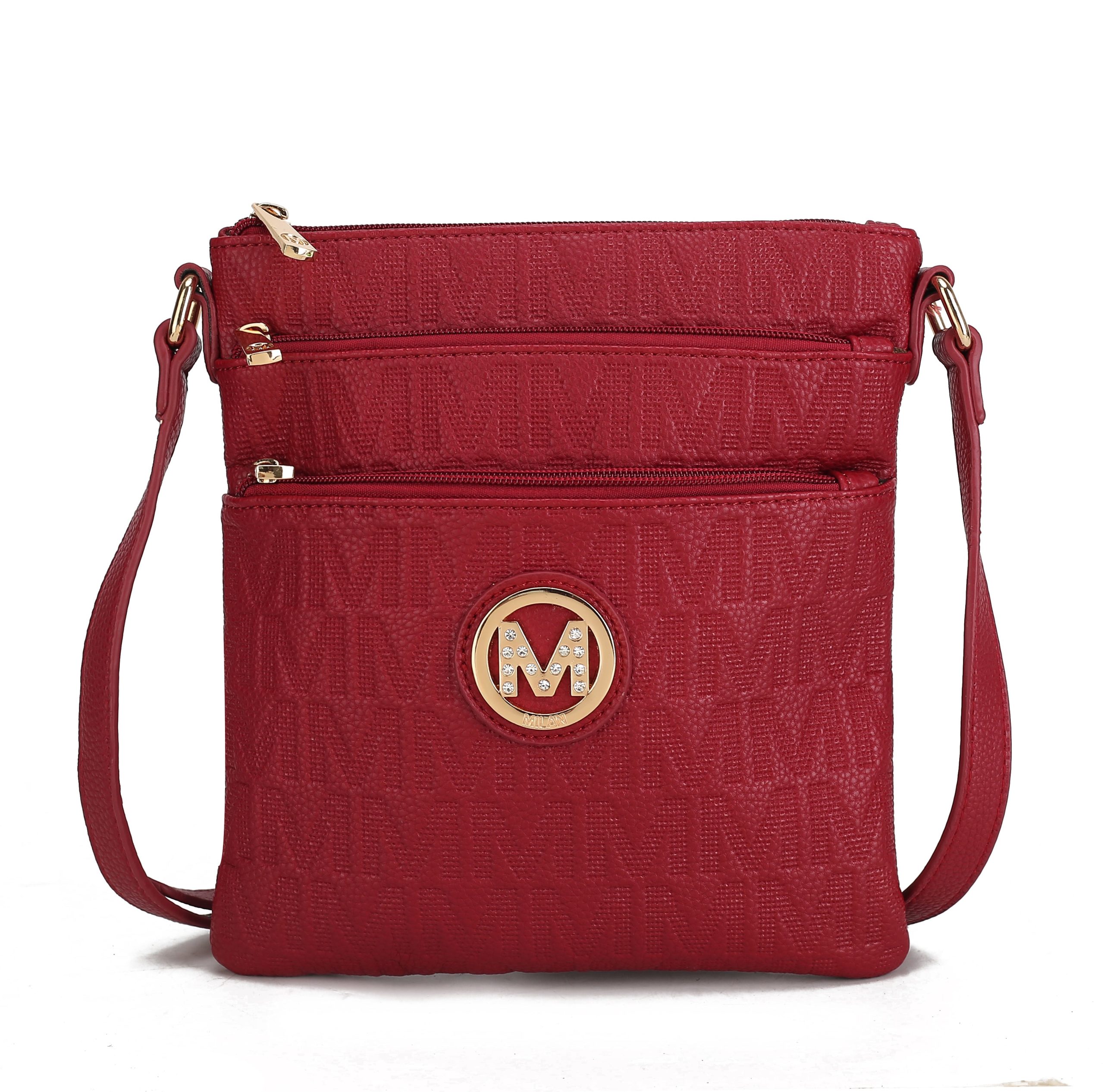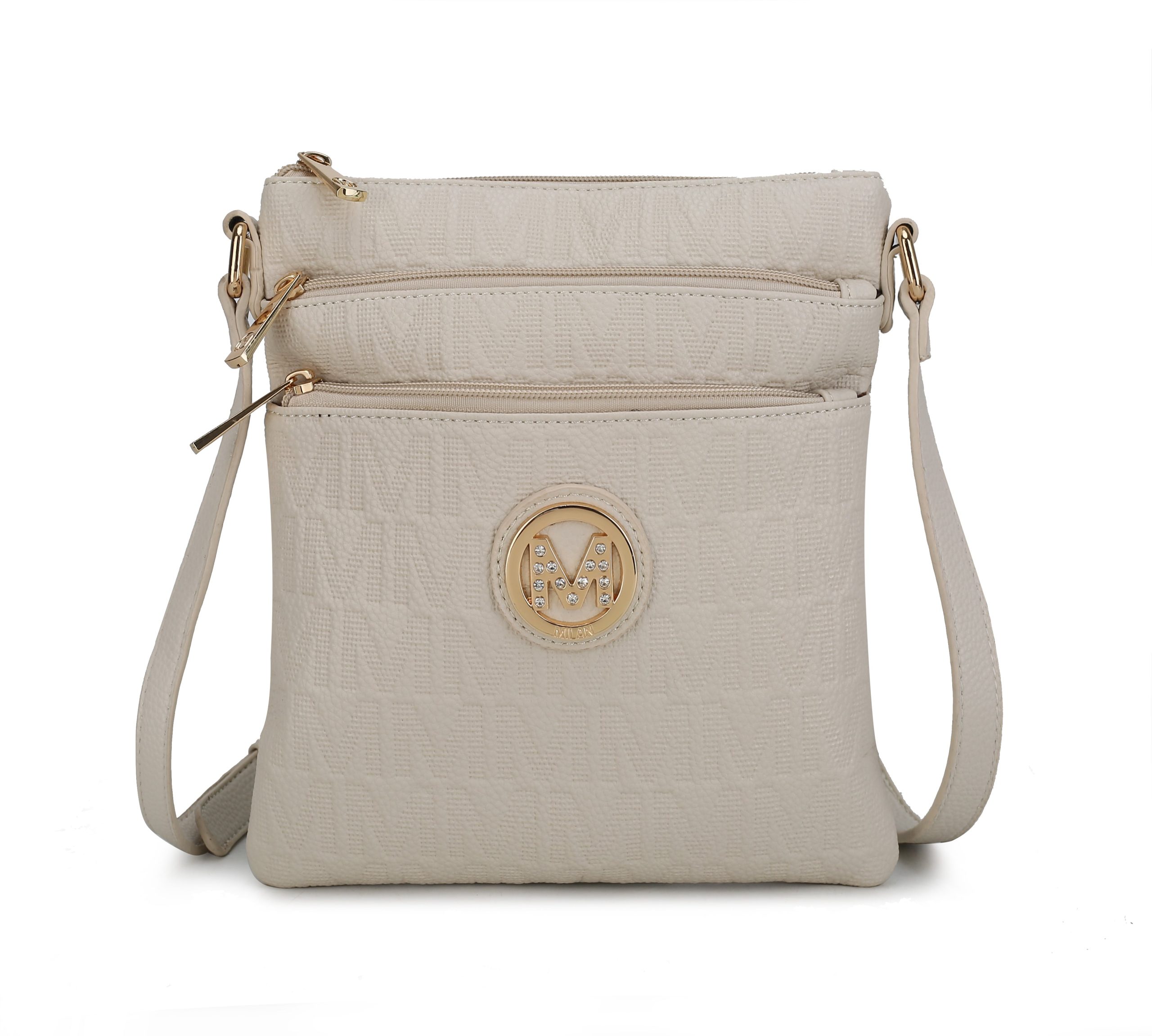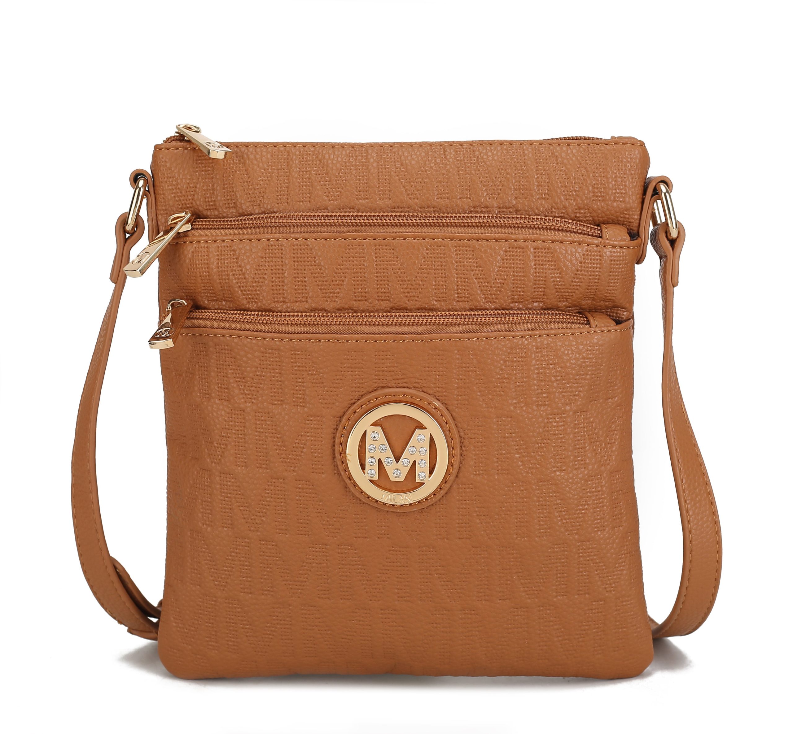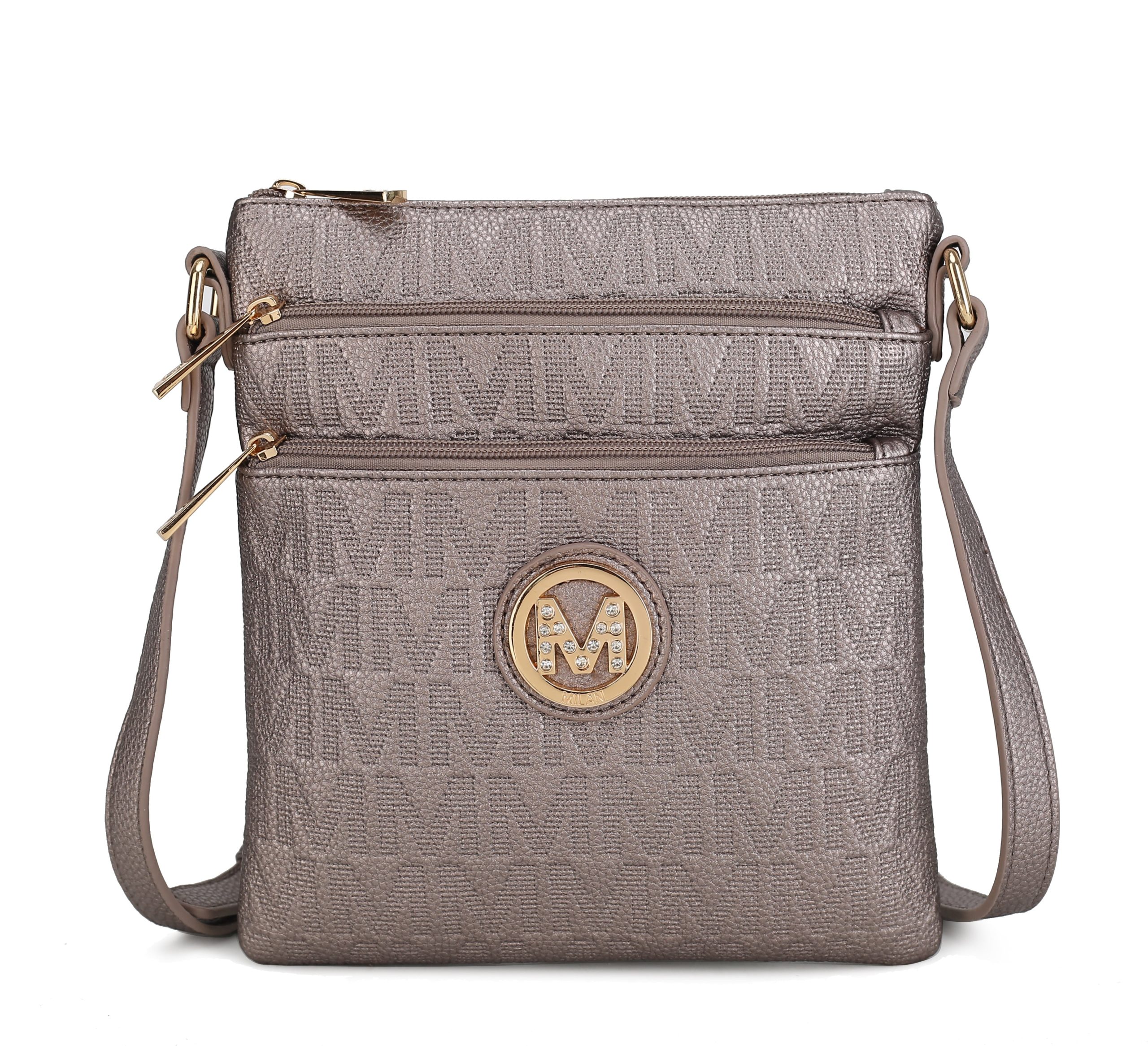 Exterior features two spacious front zipper pockets and a back-zipper pocket