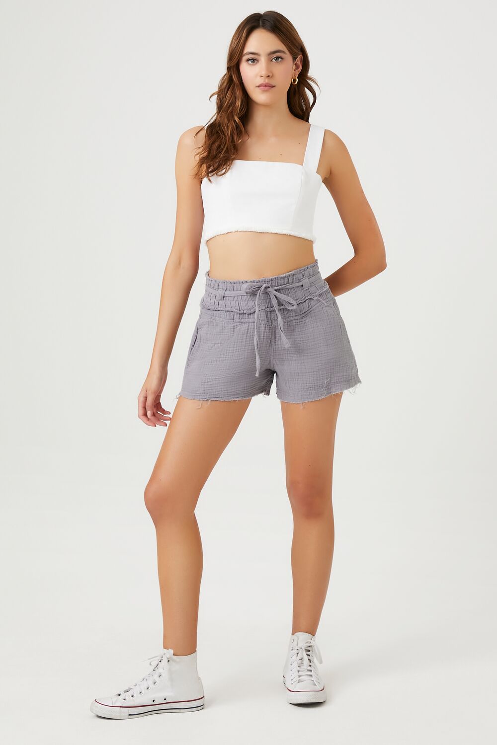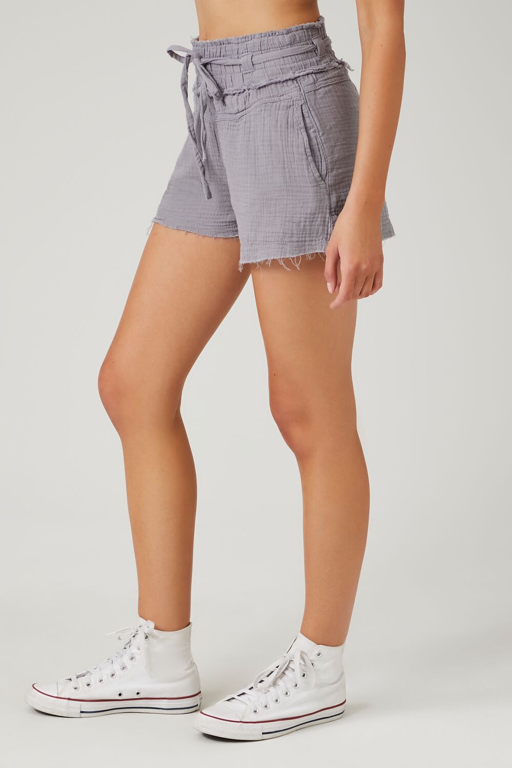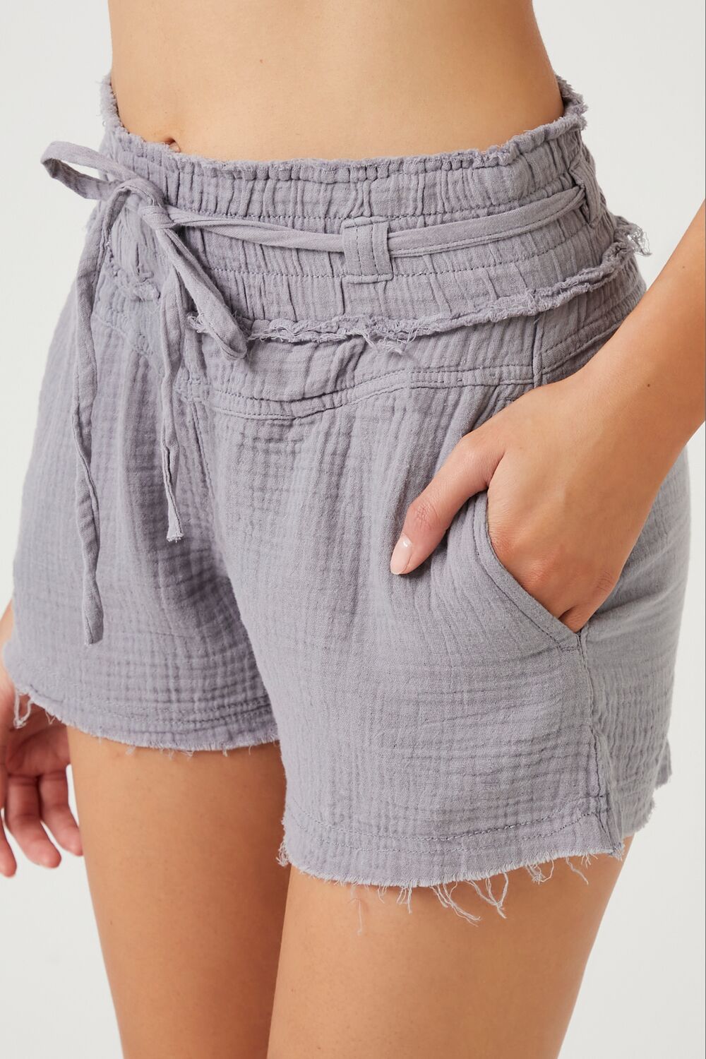 A pair of linen-blend shorts featuring an allover textured construction. high-rise drawstring waist. slanted front pockets. and raw-cut hem.