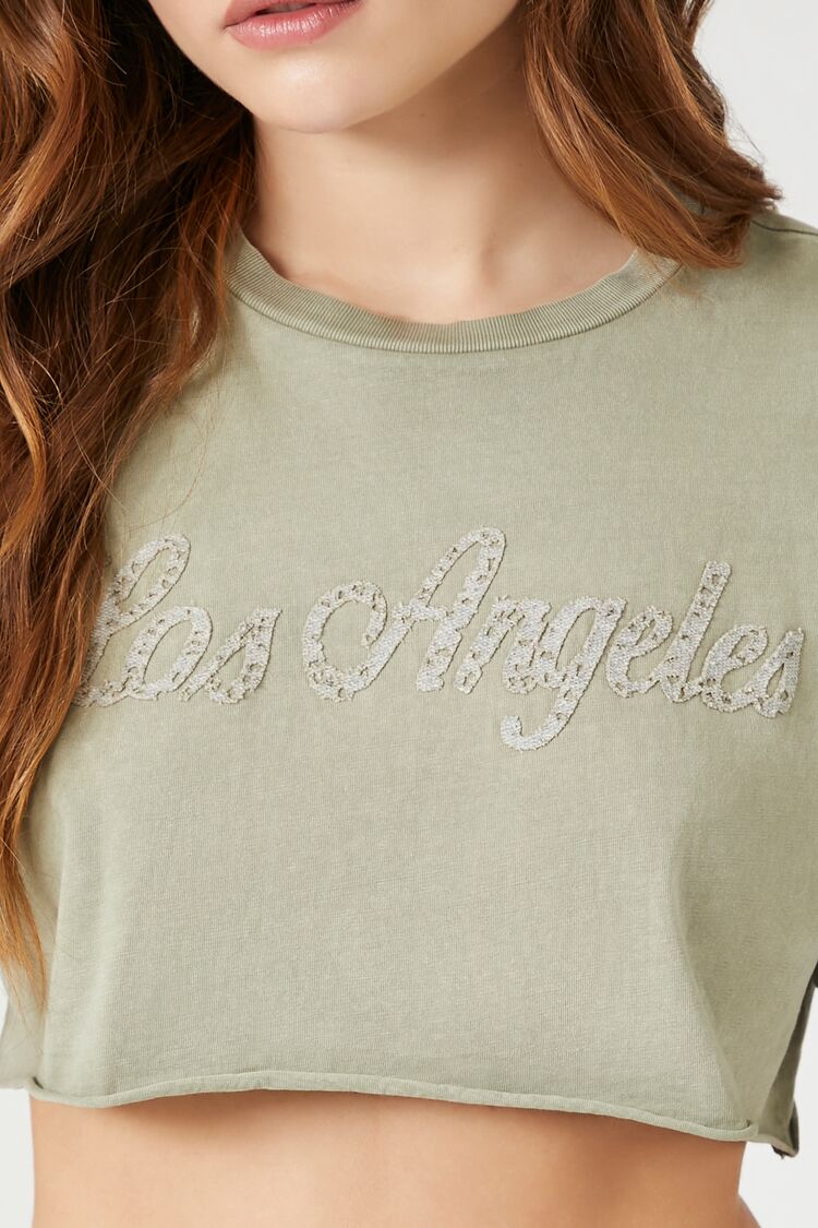 A jersey knit tee featuring front ‘Los Angeles’ text. dropped short sleeves. a crew neck. and rolled hem.