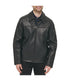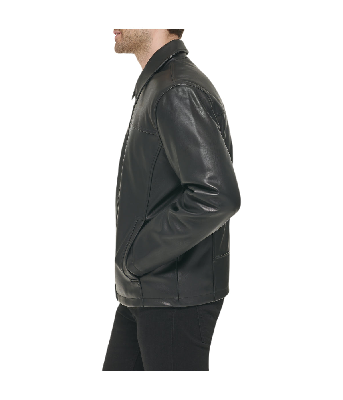 A spread collar and grainy faux-leather define a cool and collected open-bottom jacket that warms from the inside with its sleek quilted lining.