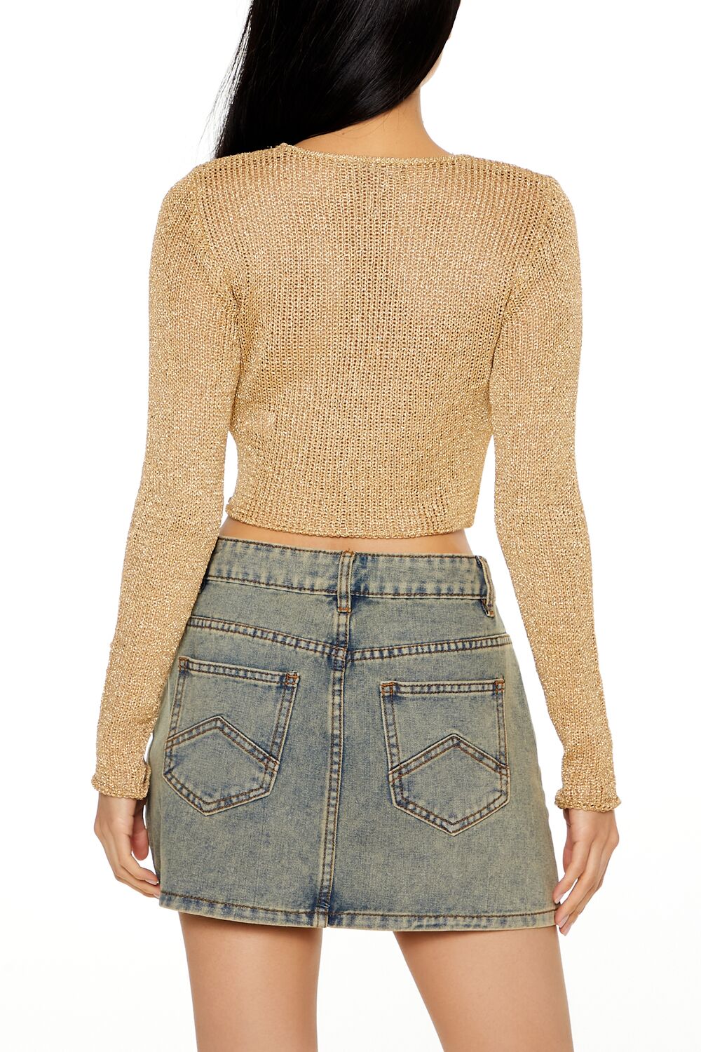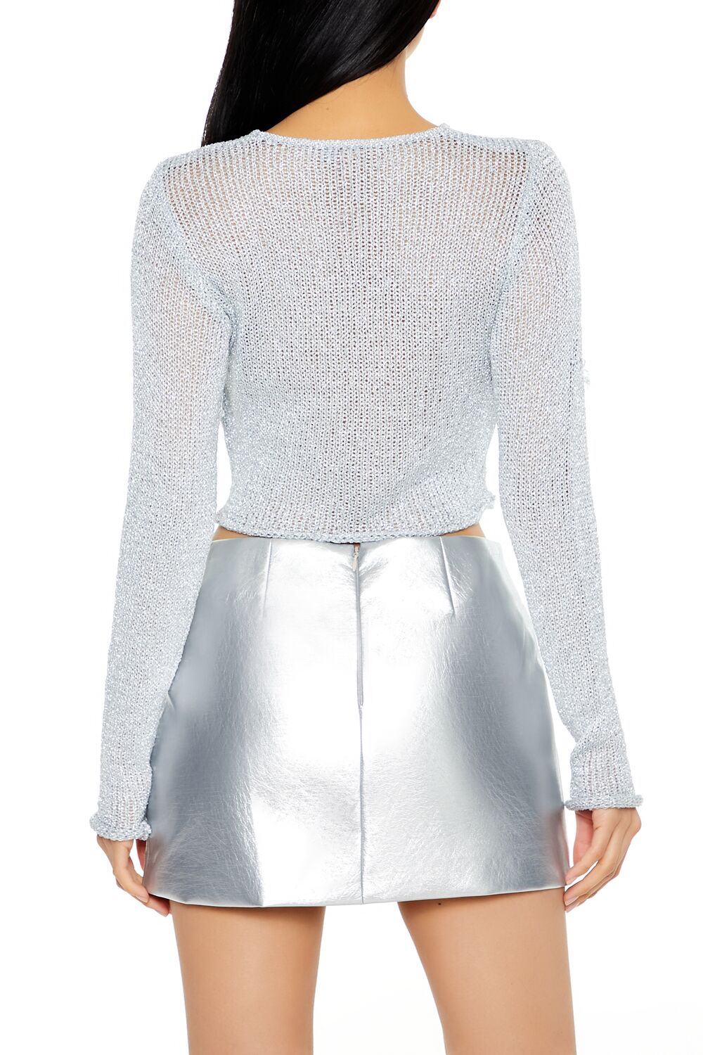 A knit sweater featuring metallic threading throughout. a round neckline. long sleeves. and cropped hem.