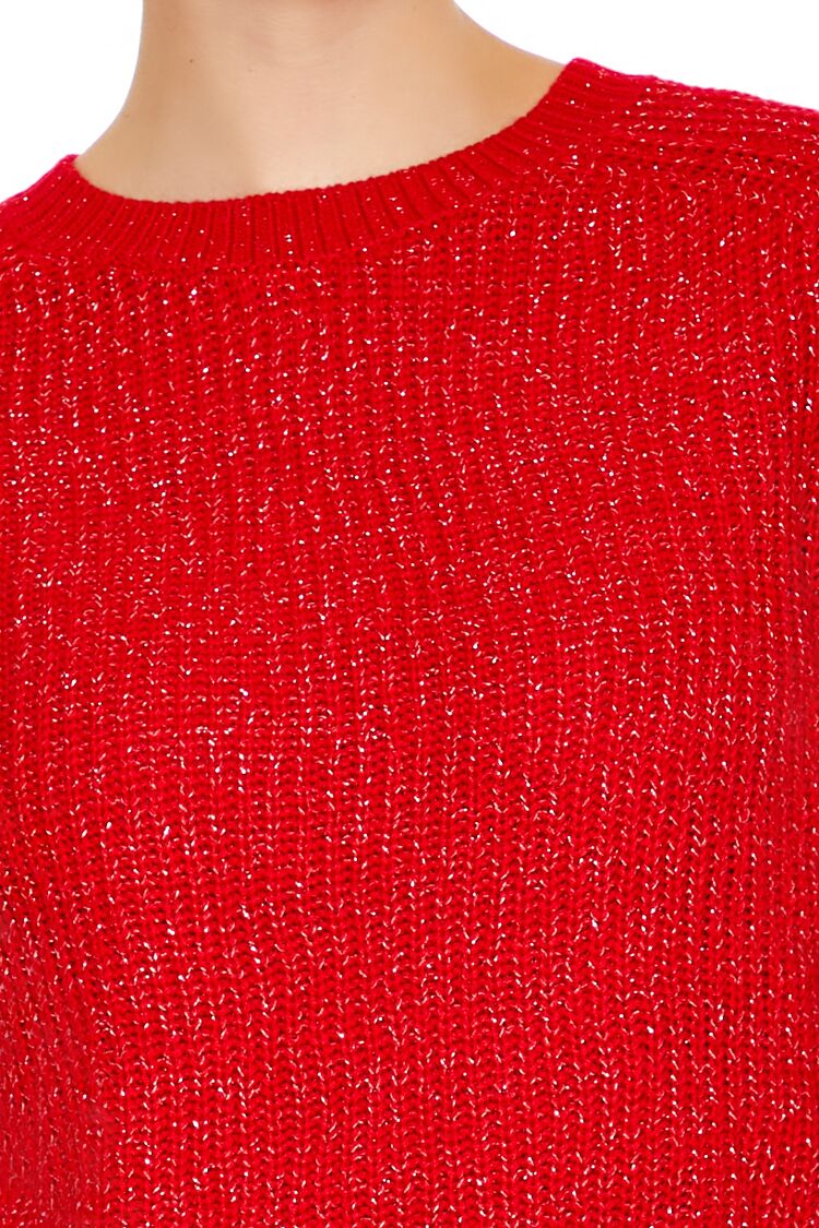 A knit sweater featuring metallic knit throughout. long raglan sleeves. a round neckline. and ribbed trim.