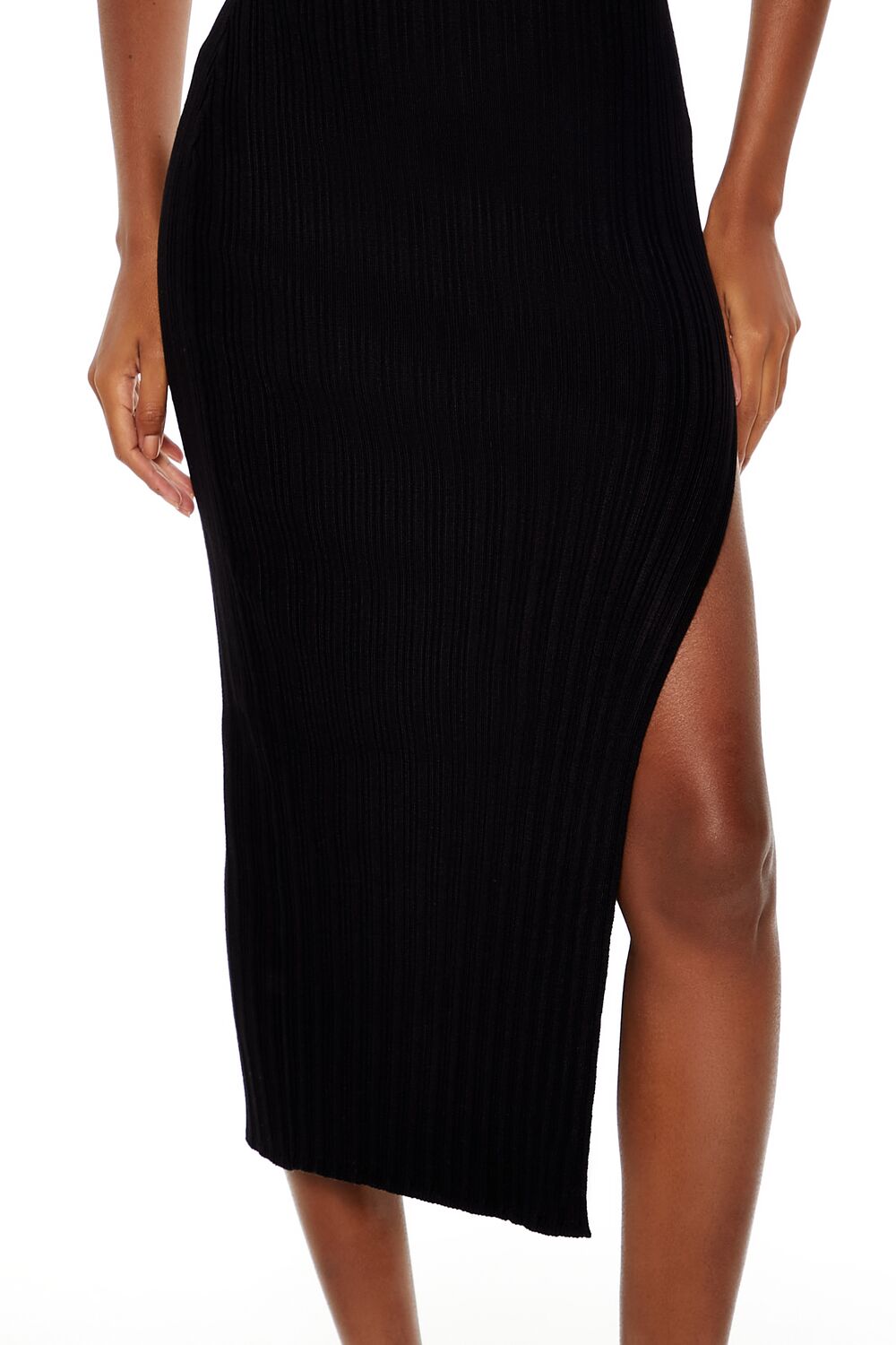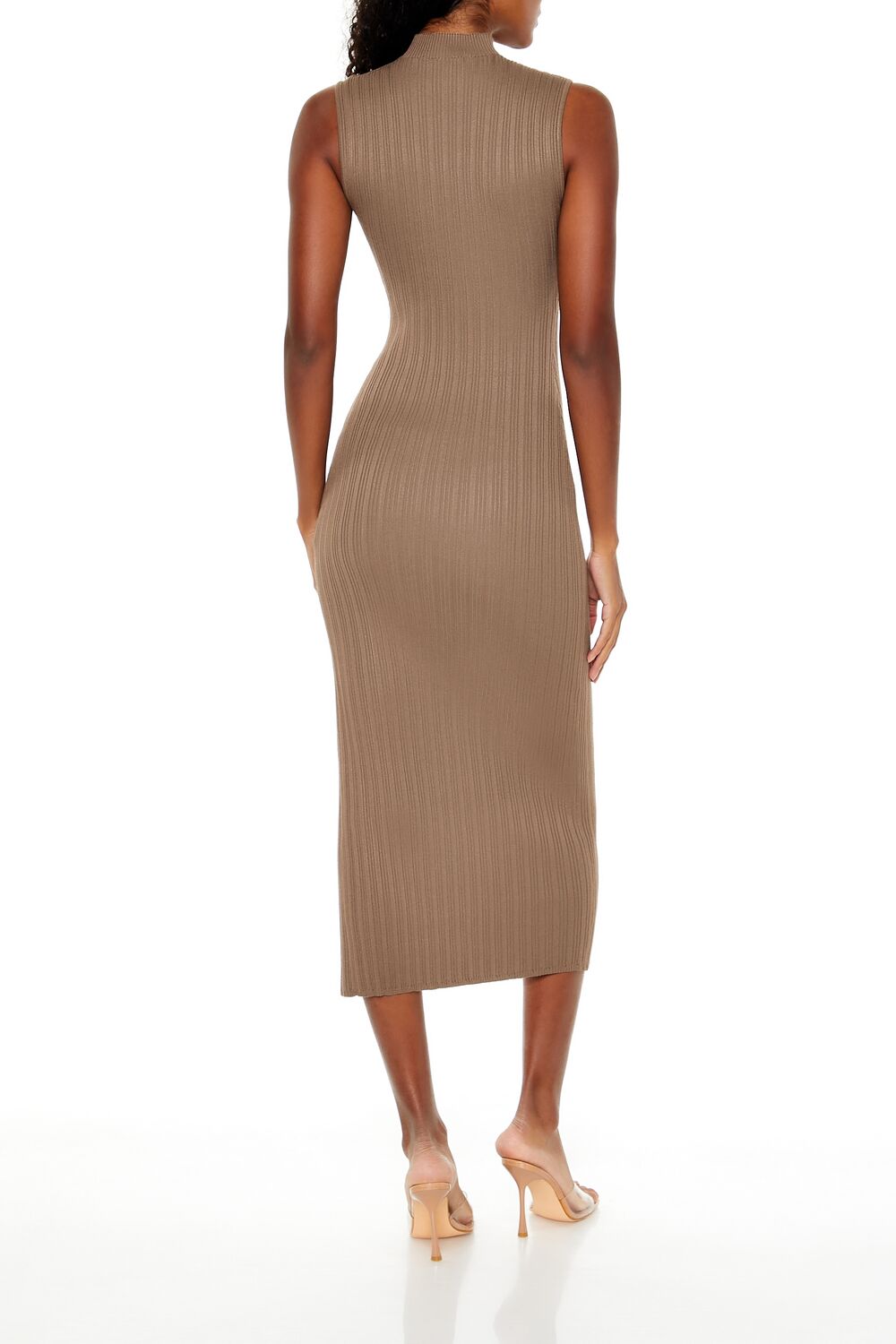 A knit sweater dress featuring a mock neck. sleeveless cut. leg front slit. midi length. and bodycon silhouette.