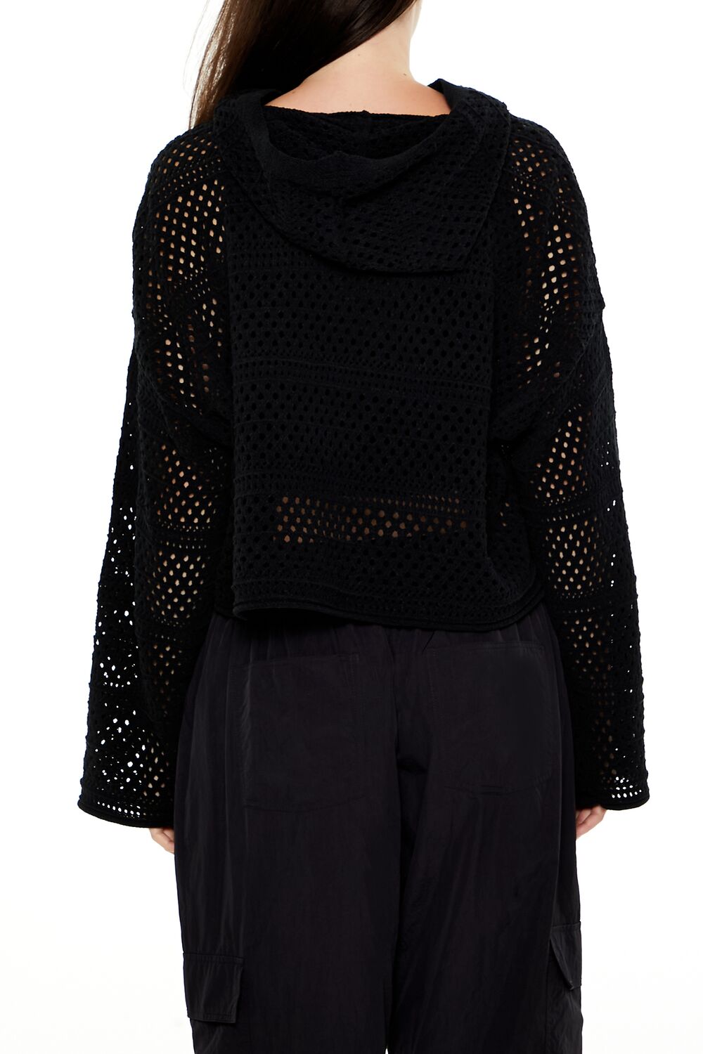A sheer knit hoodie featuring a netted construction. long sleeves. a cropped hem. and boxy fit.