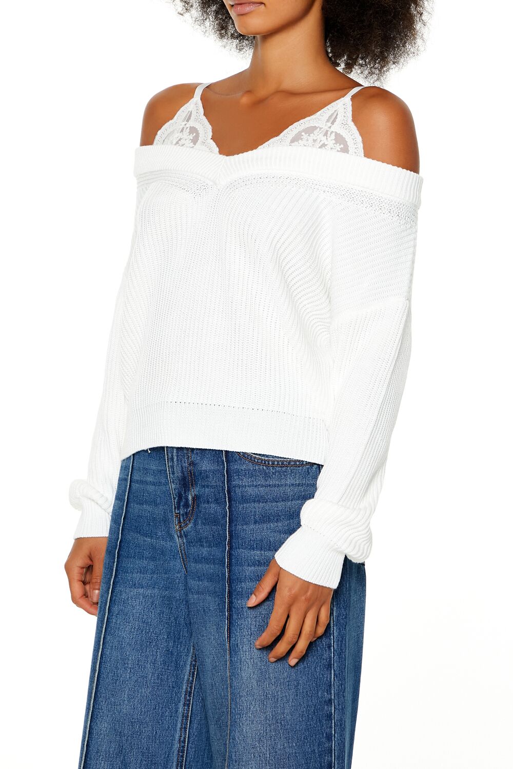 A combo top featuring a ribbed sweater with dropped long sleeves and off-the-shoulder neckline. as well as adjustable cami straps with lace details.