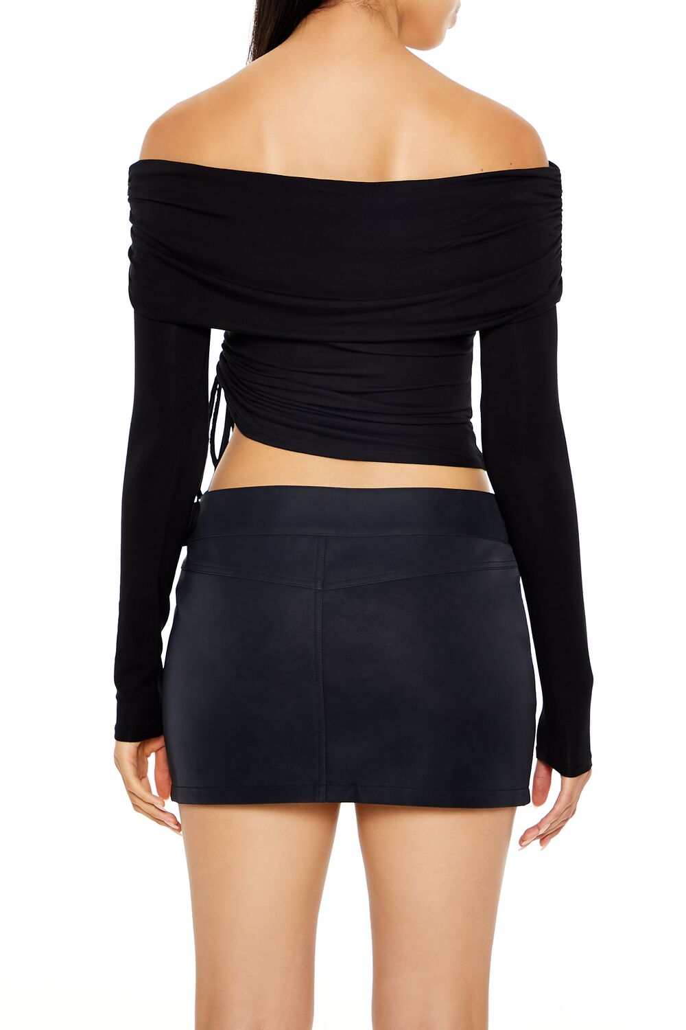 A jersey knit crop top featuring a foldover off-the-shoulder neckline. long sleeves. and ruched sides with drawstrings.