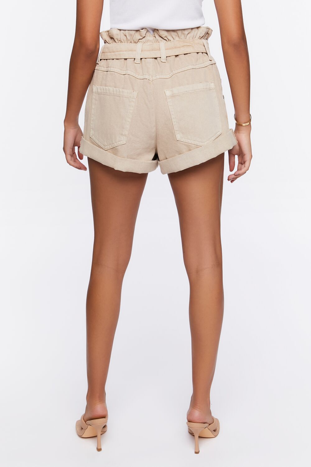 A pair of cotton shorts featuring a notched paperbag waistband. high rise. five-pocket construction. and a rolled hem.